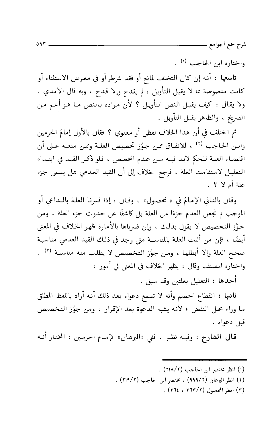 فقَالَ بَالأَوَّلِ إِمَامُ الحَرَمَيْنِ، وَابْنُ الحَاجِبِ، للاتِّفَاقِ مِمَّنْ جَوَّزَ تَخْصِيصَ العِلَّةِ ومِمَّنْ مَنَعَه علَى أَنَّ اقْتِضَاءَ العِلَّةِ للْحُكْمِ لاَ بُدَّ فِيهِ مِنْ عَدَمِ المُخَصَّصِ، فلو ذَكَرَ القَيْدَ فِي ابْتِدَاءِ التَّعْلِيلِ لاسْتَقَامَتِ العِلَّةُ، فَرَجَعَ الخِلاَفُ إِلَى أَنَّ القَيْدَ العَدَمِيَّ هَلْ يُسَمَّى جُزْءَ عِلَّةٍ أَمْ لاَ؟