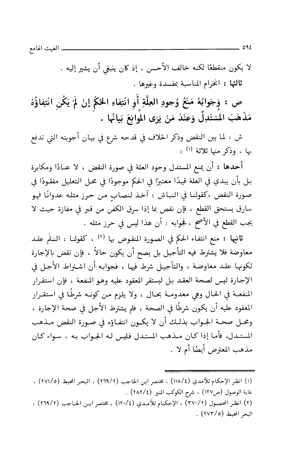 ص: وجَوَابُه مَنْعُ وُجُودِ العِلَّةِ أَو انْتِفَاءُ الحُكْمِ إِن لَمْ يكُنِ انْتِفَاؤُه مَذْهَبَ المُسْتَدِلِّ وعِنْدَ مَنْ يَرَى الموَانِعَ/ (١٧٩/أَ/م) بَيَانُهَا.