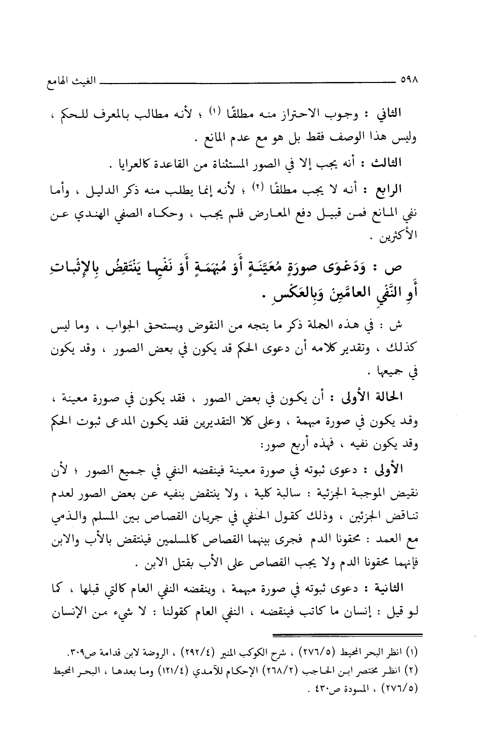 ص: ودعوَى صُورَةٍ مُعَيَّنَةٍ أَو مُبْهَمَةٍ أَو نفِيهَا ينتقِضُ بِالإِثبَاتِ أَو النفيِ العَامَّيْنِ وبَالعَكْسِ.
