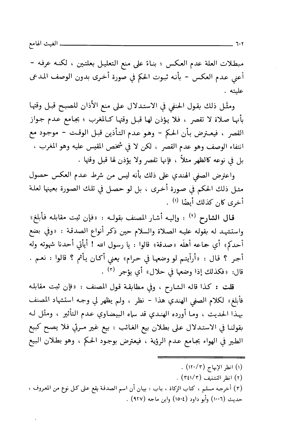 قُلْتُ: كَذَا قَالَهُ الشَّارِحُ، وفِي مطَابقِةِ قَوْلِ المُصَنِّفِ، (فَإِنْ ثَبَتَ مقَابلُه فأَبْلِغْ) لكلاَمِ الصَّفِيِّ الهِنْدِيِّ هذَا ـ نَظَرٌ، ولم يَظْهَرْ لي وجهُ استشهَادِ المُصَنِّفِ بهذَا الحديثِ، ومَا أَوْرَدَهُ الهِنْدِيُّ قَد سمَّاه البَيْضَاوِيُّ عدمَ التّأَثيرِ، ومثَّلَ لَهُ بِقَوْلِنَا فِي الاستدلاَلِ علَى بُطْلانِ بيعِ الغَائبِ: بيعٍ غَيْرِ مرئيٍّ فَلاَ يصِحُّ كبيعِ الطّيرِ فِي الهوَاءِ بجَامعِ عدمِ الرّؤيةِ، فَيعترَّضُ بوجودِ الحُكْمِ، وهو بطلاَنُ البَيْعِ
