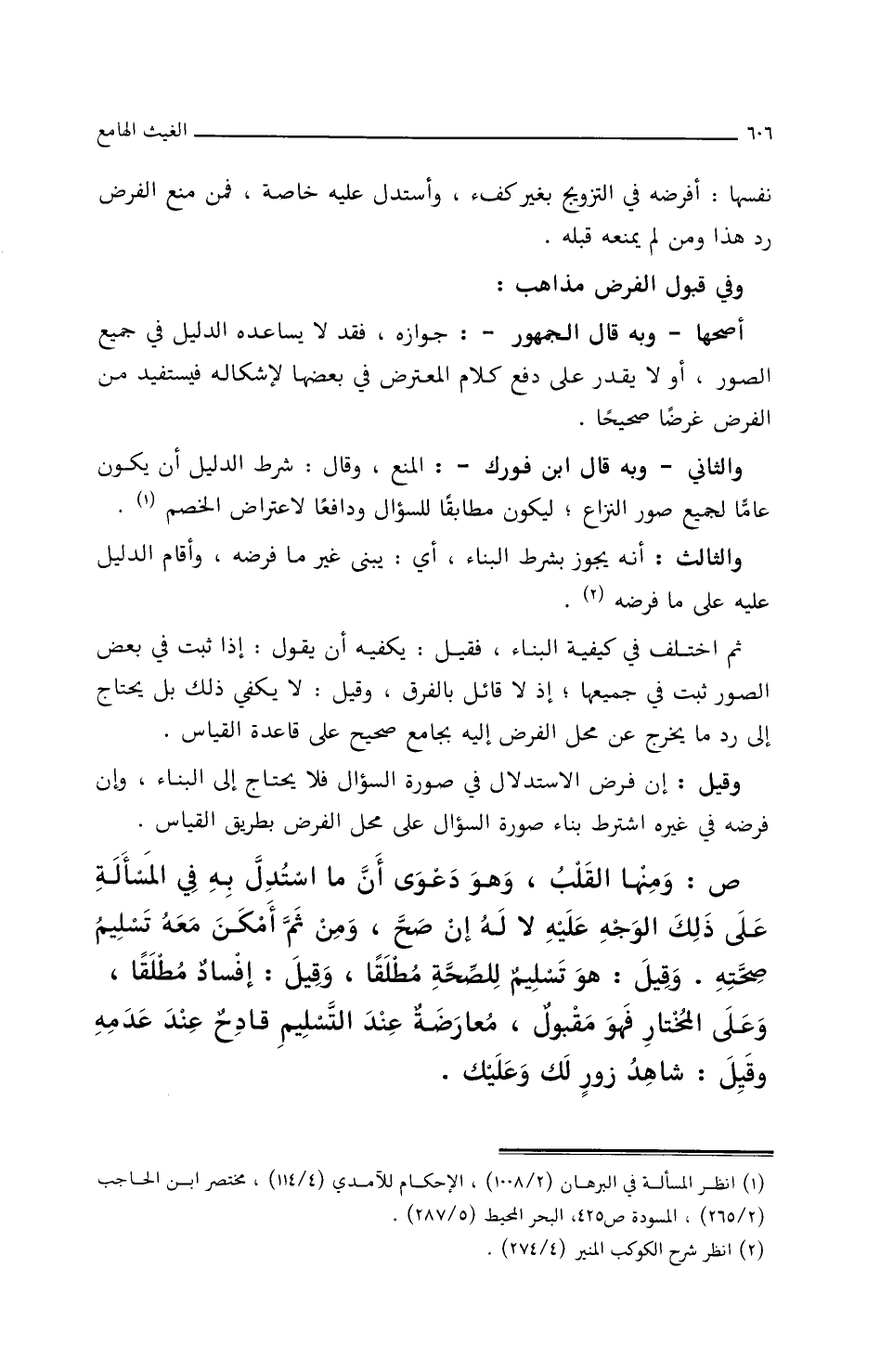 أَصحُّهَا ـ وَبِهِ قَالَ الجُمْهُورُ ـ: جَوَازهُ، فقد لاَ يسَاعدُه الدَّلِيلُ فِي جَمِيعِ الصورِ أَو لاَ يقدِرُ علَى دَفْعِ كلاَمِ المُعْتَرَضِ فِي بعضِهَا لإِشكَالِه فِيستفِيدُ مِنَ الفرضِ غرضًا صحيحًا.