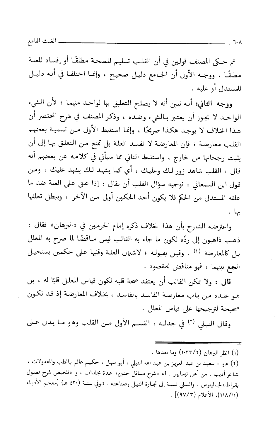 وَوَجْهُ الثَّانِي أَنَّهُ تَبَيَّنَ أَنَّهُ لاَ يصلُحُ التّعليقُ بِهَا لوَاحدٍ مِنْهُمَا؛ لأَنَّ الشيءَ الوَاحِدَ لاَ يَجُوزُ أَنْ يَعْتَبِرَ بِالشيءِ وضِدِّهِ، وذَكَرَ المُصَنِّفُ فِي شرحِ المختصَرِ أَنَّ هذَا الخِلاَفَ لاَ يُوجَدُ هكذَا صريحًا، وإِنَّمَا استنبَطَ الأَوَّلَ مِنْ تسميةِ بعضِهم القلبَ معَارضةَ، فإِنَّ المُعَارضَةَ لاَ تفِسُد العِلَّةُ بَلْ تَمْنَعُ مِنَ التَّعَلُّقِ بِهَا إِلَى أَنْ يثبُتُ رُجْحَانُهَا من خَارجِ، وَاستنبطَ الثَّانِي ممَا سَيَأْتِي فِي كلاَمِهِ عَن بعضِهم أَنَّهُ قَالَ: القلبُ شَاهدُ زورٍ لَك وعليكَ؛ أَي: كَمَا يشهدُ لَكَ يشهَدُ عليك، ومِنْ قَوْلِ ابنِ السَّمْعَانِيِّ: توجيهُ سؤَالِ القَلْبِ أَنْ يقَالَ: إِذَا عَلَّقَ علَى العِلَّةِ ضدَّ مَا عَلَّقَهُ المُسْتَدِلِّ مِنَ الحُكْمِ فَلاَ يَكُونُ أَحدُ الحُكْمَيْنِ أَولَى مِنَ الآخرِ، ويَبْطُلُ تعلُّقُهَا بِهَا، وَاعترضَه الشَّارِحُ بأَنَّ هذَا الخِلاَفَ ذَكَرَهُ إِمَامُ الحَرَمَيْنِ فِي (البُرْهَانِ) فقَالَ: ذَهَبَ ذَاهبونَ إِلَى ردِّهِ لكونِ مَا جَاءَ بِهِ القَالِبُ لَيْسَ منَاقِضًا لمَا صرَّحَ بِهِ المُعَلَّلُ بَلْ كَالمعَارضةِ.