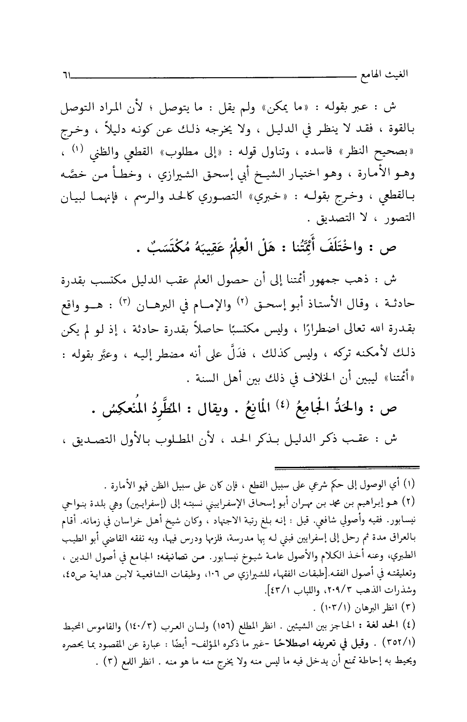 ش: ذهب جمهور أئمتنا إلى أن حصول العلم عقب الدليل مكتسب بقدرة حادثة، وقال الأستاذ أبو إسحاق والإمام في البرهان: هو واقع بقدرة الله تعالى اضطراراً، وليس مكتسباً حاصلاً بقدرة حادثة، إذا لو لم يكن ذلك لأمكنه / (٩أ /د) تركه، وليس كذلك، فدل على أنه مضطر إليه، وعبر بقوله: (أئمتنا) ليبين أن الخلاف في ذلك بين أهل السنة.