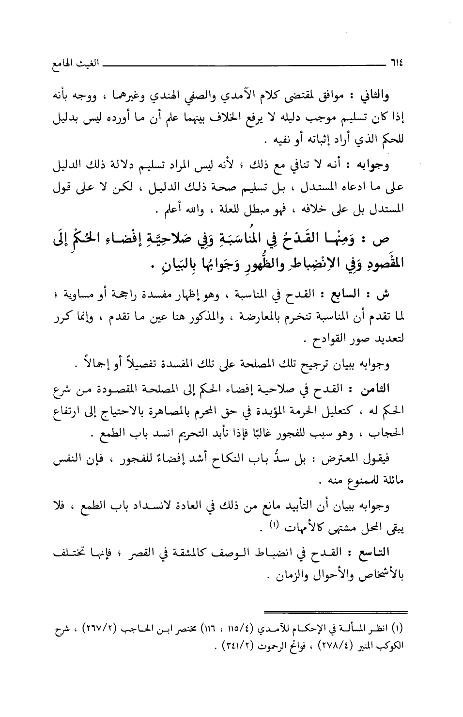 ص: وَمِنْهَا القَدْحُ فِي المُنَاسَبَةِ وفِي صَلاَحِيَّةِ إِفْضَاءِ الحُكْمِ إِلَى المَقْصُودِ وفِي الانضبَاطِ وَالظهورِ، وجَوَابُهَا بِالبيَانِ.