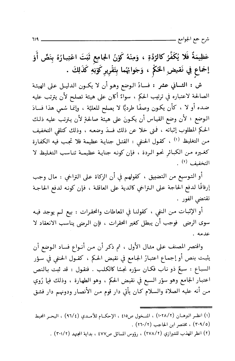 ش: الثَّانِي عشرَ: فسَادُ الوضعِ، وهو أَنْ لاَ يَكُونَ الدَّلِيلُ علَى الهيئةِ الصَّالحةِ لاعتبَارِهِ فِي تَرْتِيبِ الحُكْمِ، سَوَاءً أَكَانَ علَى هيئةٍ تصلُحُ لأَنْ يترتَّبَ عَلَيْهِ ضدُّه أَو لاَ، كأَنْ يَكُونَ وصفًا طرديًا لاَ يصلُحُ للعِلِّيَّةِ، وإِنَّمَا سُمِّيَ هذَا فسَادُ الوضعِ؛ لأَنَّ وضْعَ القِيَاسِ أَنْ يَكُونَ علَى هيئةٍ صَالحةٍ؛ لأَنْ يترتَّبَ عَلَيْهِ ذَلِكَ الحُكْمُ المطلوبُ إِثبَاتُهُ، فمتَى خلاَ عن ذَلِكَ فسَدَ وَضْعُهُ، وذلك كتَلَقِّي التّخفِيفِ مِنَ التّغليظِ، كقولِ الحَنَفِيِّ: القتلُ جنَايةٌ عظيمةٌ فَلاَ تجِبُ فِيهِ الكفَارةُ كغيرِهِ مِنَ الكبَائرِ نحوَ الرَّدَّةِ، فإِنَّ كَوْنَهُ جنَايةً عظيمةً تُنَاسِبُ التَّغْلِيظَ لاَ التّخفِيفَ.