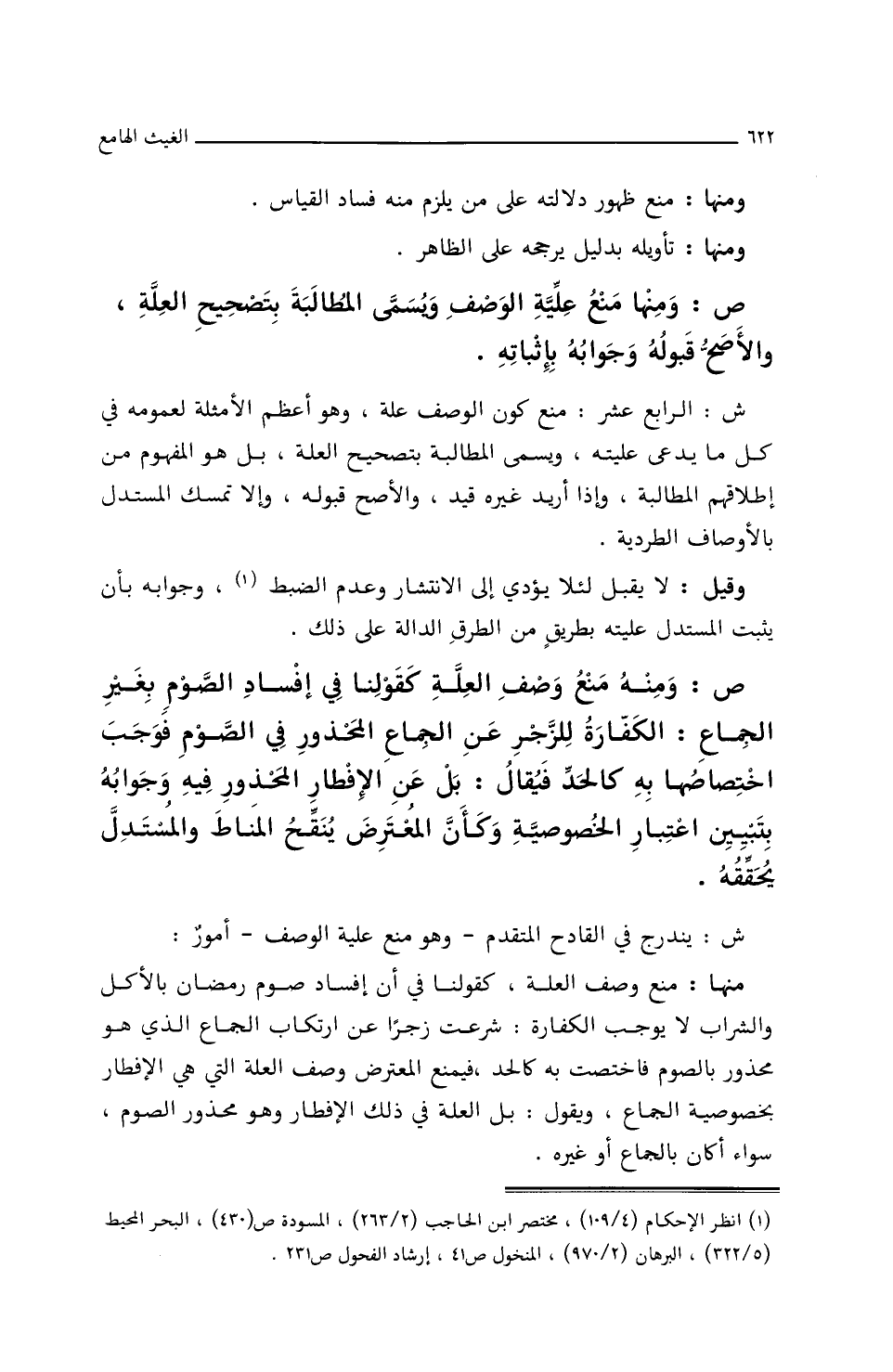 ص: ومِنْهُ مَنْعُ وصفِ العِلَّةِ كَقَوْلِنَا فِي إِفسَادِ الصّومِ بِغَيْرِ الجِمَاعِ: الكفَارةُ للزجرِ عَنِ الجمَاعِ المحذورِ فِي الصومِ فوجَبَ اختصَاصُهَا بِهِ كَالحدِّ فيُقَالُ: بَلْ عَنِ الإِفطَارِ المحذورِ فِيهِ وجوَابُهُ بتبيينِ اعتبَارِ الخصوصيَّةِ، وكأَنَّ المُعْتَرِضَ يُنَقِّحُ المَنَاطَ وَالمستدلُّ يُحَقِّقُهُ.