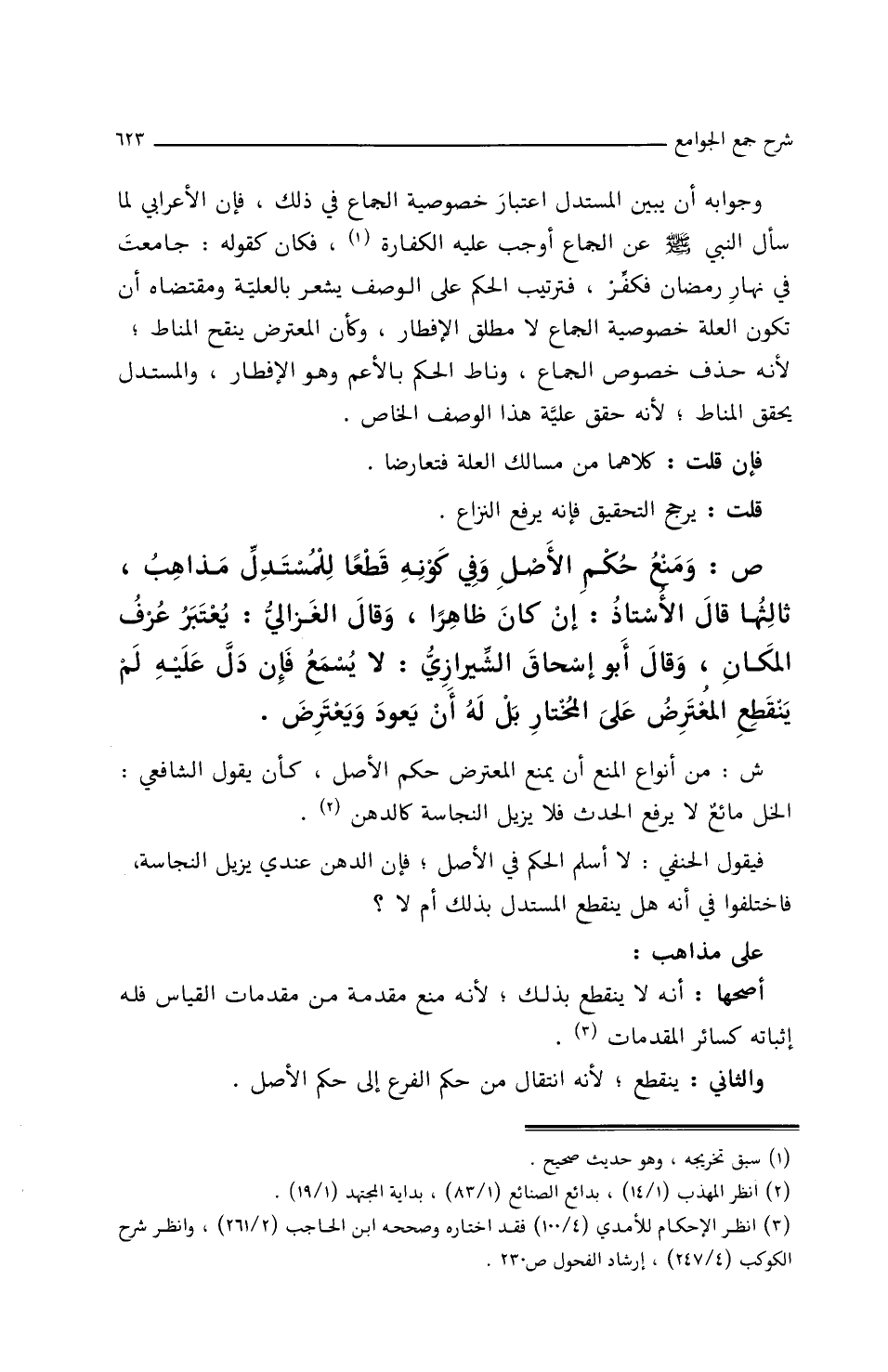 ص: ومَنْعُ حُكْمِ الأَصْلِ وفِي كَوْنِهِ قَطْعًا للمُسْتَدِلِّ مَذَاهِبُ، ثَالِثُهَا قَالَ الأَستَاذُ: إِن كَانَ ظَاهِرًا، وقَالَ الغَزَالِيُّ: يُعْتَبَرُ عُرْفُ المكَانِ، وقَالَ أَبُو إِسْحَاقَ الشّيرَازيُ: لاَ يُسْمَعُ فإِنْ دَلَّ عَلَيْهِ لَمْ يَنْقَطِعُ المُعْتَرِضُ علَى المُخْتَارِ بَلْ لَهُ أَن يعودَ ويَعْتَرِضَ.