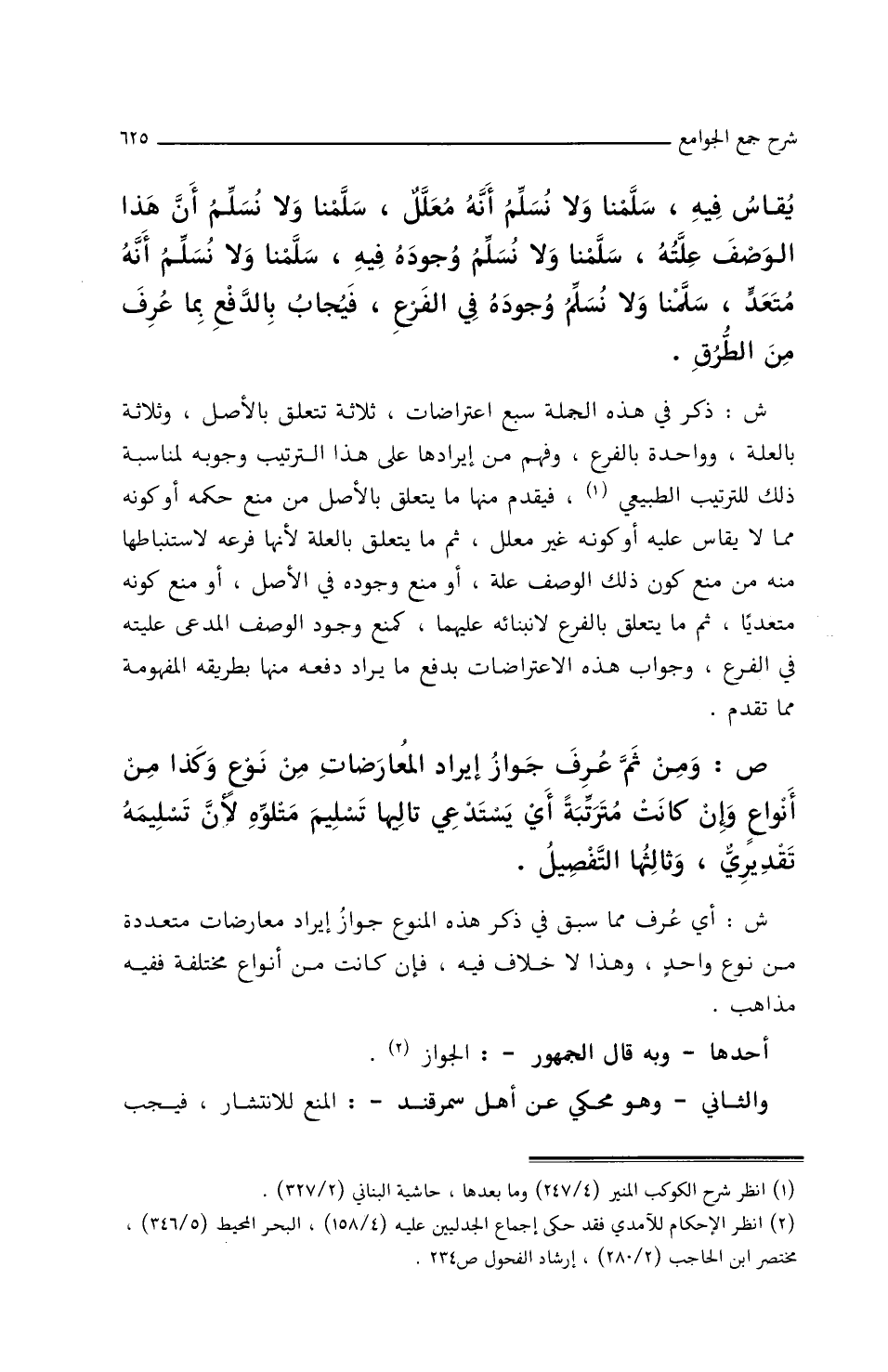 ش: ذَكَرَ فِي هذه الجُمْلَةِ سَبْعَ اعترَاضَاتٍ، ثلاَثَةٌ تتعلَّقُ بَالأَصْلِ، وثلاَثَةٌ بَالعِلَّةِ، ووَاحِدَةٌ بَالفَرْعِ، وفُهِمَ مِنْ إِيرَادِهَا علَى هذَا التّرتيبِ وجوبُه لمنَاسبةِ ذَلِكَ للترتيبِ الطَّبِيعِيِّ، فَيُقَدَّمُ مِنْهَا مَا يتعلَّقُ بَالأَصْلِ مِنْ مَنْعِ حُكْمِهِ أَو كَوْنِهِ مِمَّا لاَ يُقَاسُ عَلَيْهِ أَو كَوْنُهُ غَيْرَ مُعَلَّلٍ، ثُمَّ مَا يَتَعَلَّقُ بِالعِلَّةِ؛ لأَنَّهَا فَرْعُهُ لاستنبَاطِهَا مِنْهُ مِنْ مَنْعِ كَوْنِ ذَلِكَ الوَصْفِ عِلَّةً أَو مَنْعِ وُجُودِهِ فِي الأَصْلِ أَو مَنْعِ كَوْنِهِ مُتَعَدِّيًا، ثُمَّ مَا يتعلَّقُ بَالفَرْعِ لانْبِنَائِهِ عَلَيْهِمَا، كمَنْعِ وُجُودِ الوَصْفِ المُدَّعَى عِلِّيَّتُهُ فِي الفَرْعِ، وجوَابُ هَذِهِ الاعترَاضَاتُ بِدَفْعِ مَا يُرَادُ دَفْعُه مِنْهَا بطريقِه المفهومةِ ممَّا تقدَّمَ.