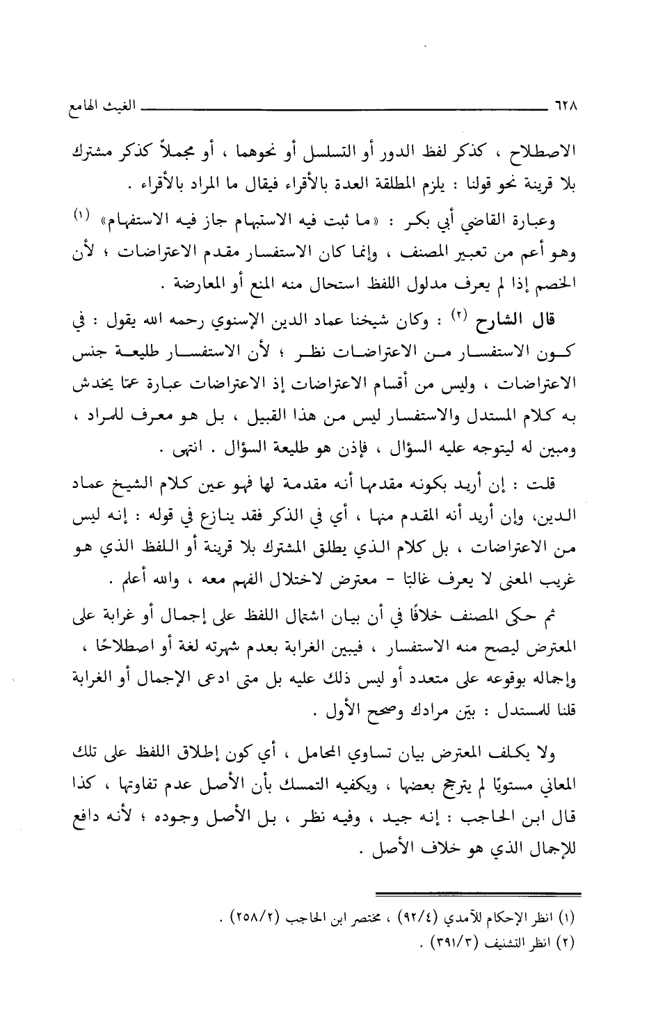 وعبَارةُ القَاضِي أَبِي بكرٍ: (مَا ثَبَتَ فِيهِ الاستبْهَامُ جَازَ فِيهِ الاستفهَامُ، وهو أَعمُّ مِنْ تعبيرِ المُصَنِّفِ، وإِنمَا كَانَ الاستفسَارُ مُقَدَّمُ الاعترَاضَاتِ؛ لأَنَّ الخَصْمَ إِذَا لَمْ يَعْرِفْ مَدْلُولَ اللّفْظِ استحَالَ مِنْهُ المَنْعُ أَو المعَارضَةُ.