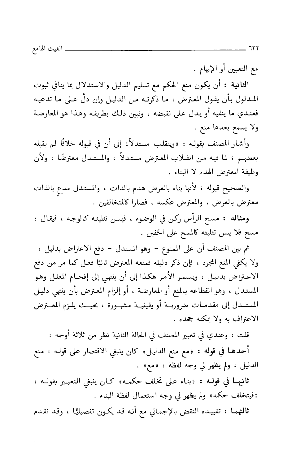 أَحدِهَا فِي قَوْلِهِ: (مَعَ مَنْعِ الدَّلِيلِ) كَانَ يَنْبَغِي الاقتصَارُ علَى قَوْلِهِ: مَنْعُ الدَّلِيلِ، ولَمْ يَظْهَرْ لِي وَجْهُ لَفْظِةِ: (مَعَ).