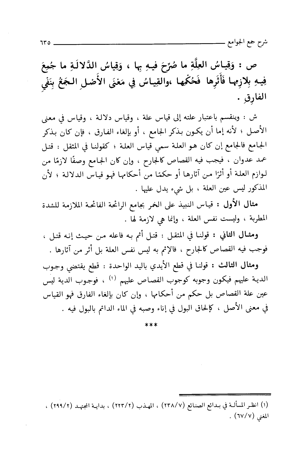 ش: ويَنْقَسِمُ بِاعْتِبَارِ عِلَّتِهِ إِلَى: قِيَاسِ عِلَّةٍ، وقِيَاسِ دِلاَلَةٍ، وقِيَاسٍ فِي مَعْنَى الأَصْلِ؛ لأَنَّهُ إِمَّا أَنْ يَكُونَ بِذِكْرِ الجَامِعِ، أَوْ بِإِلغَاءِ الفَارقِ، فَإِنْ كَانَ بِذِكْرِ الجَامِعِ فَالجَامِعُ إِنْ كَانَ هو العِلَّةُ سُمِّيَ قِيَاسَ العِلَّةِ، كَقَوْلِنَا فِي المُثَقَّلِ قُتِلَ: عَمْدُ عُدْوَانٍ، فَيَجِبُ فِيهِ القِصَاصُ كَالجَارحِ، وإِنْ كَانَ الجَامِعُ/ (١٥٨/أَ/د) وَصْفًا لاَزِمًا مِنْ لَوَازِمِ العِلَّةِ أَوْ أَثرًا مِنْ آثَارِهَا أَو حَكْمًا مُنْ أَحكَامِهَا فَهُو قِيَاسُ الدِّلاَلةِ؛ لأَنَّ المذكورَ لَيْسَ عَيْنُ العِلَّةِ، بَلْ شَيْءٌ يَدُلُّ عَلَيْهَا، مِثَالُ الأَوَّلِ: قِيَاسُ النَّبِيذِ علَى الخَمْرِ بِجَامِعِ الرَّائحةِ الفَائحةِ الملاَزمةِ لِشِدَّةِ المُطْرِبَةِ، ولَيْسَتْ نَفْسُ العِلَّةِ، وإِنَّمَا هي لاَزِمَةٌ لَهَا.