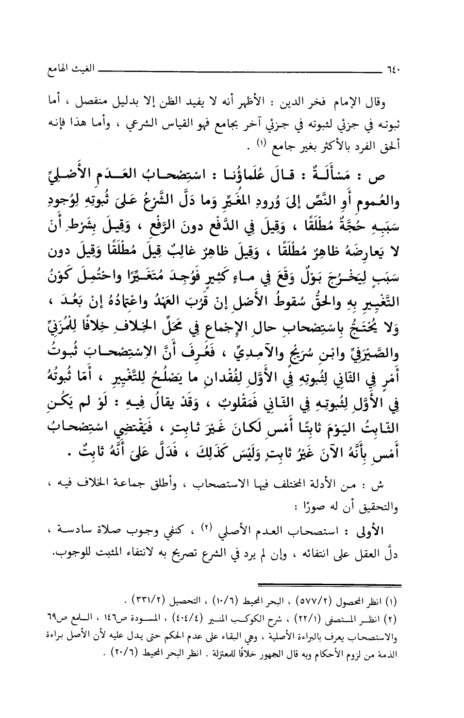 ص: مسأَلةٌ: قَالَ علمَاؤُنَا: استصحَابُ العَدَمِ الأَصْليِّ، وَالعمومُ أَو النَّصُّ إِلَى وُرُودِ المغيرِ ومَا دلَّ الشَّرْعُ علَى ثُبُوتِهِ لوجودِ سببِه حُجَّةً مُطْلَقًا وَقِيلَ فِي الدّفعِ دُونَ الرَّفْعِ وَقِيلَ بِشَرْطِ أَنْ لاَ يعَارِضُه ظَاهرٌ مُطْلَقًا وَقِيلَ ظَاهِرٌ غَالَبٌ قيلَ مُطْلَقًا، وَقِيلَ: دُونَ سببٍ؛ لِيَخْرُجَ بولٌ وَقَعَ فِي مَاءٍ كثيرٍ فَوَجَدَ مُتَغَيِّرًا وَاحْتَمَلَ كَوْنَ التّغِييرِ بِهِ، وَالحقُّ سقوطُ الأَصْلِ إِنَّ قُرْبَ العهدِ وَاعتمَادَه إِنْ بَعُدَ ولاَ يُحَتَّجُّ بَاستصحَابِ حَالِ الإِجمَاعِ فِي مَحَلِّ الخِلاَفِ خِلاَفًا للمُزَنِيِّ وَالصيرفِي وَابْنِ سُرَيْجٍ وَالآمِدِيُّ فَعُرِفَ أَنَّ الاستصحَابَ ثُبُوتُ أَمْرٍ فِي الثَّانِي لثُبُوتِهِ فِي الأَوَّلِ لِفُقْدَانِ مَا يصلُحُ للتغييرِ أَمَّا ثُبُوتُه فِي الأَوَّلِ لثُبُوتِهِ فِي الثَّانِي فَمَقْلُوبٌ، وَقَدْ يقَالُ فِيهِ لو لَمْ يَكُنِ الثَّابتُ اليومَ ثَابِتًا أَمسِ لكَانَ غَيْرَ ثَابِتٍ فِيقتضِي استصحَابُ أَمسِ بأَنَّهُ الآنَ غَيْرُ ثَابِتٍ وَلَيْسَ كَذَلِكَ فدَلَّ علَى أَنَّهُ ثَابِتٌ.