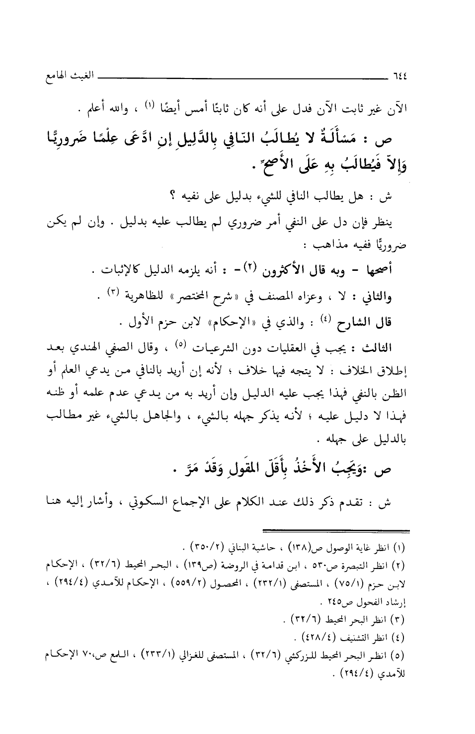 ص: مسأَلةٌ لاَ يُطَالَبُ النَّافِي بِالدليلِ إِنِ ادَّعَى علمًا ضَرُورِيًّا وإِلاَّ فَيُطَالَبُ بِهِ علَى الأَصحِّ.