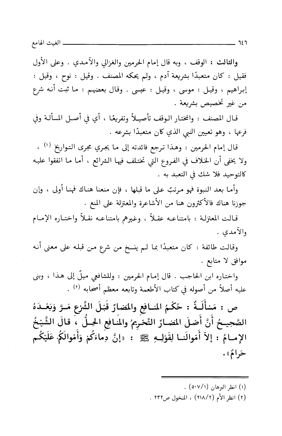 ص: مسأَلةٌ: حُكْمُ المنَافعِ وَالمَضَارِّ قَبْلَ الشَّرْعِ مَرَّ وبعدَه الصَّحِيحُ أَنَّ أَصلَ المضَارِّ التَّحْرِيمُ وَالمنَافِعَ الحلُّ قَالَ الشَّيْخُ الإِمَامُ: إِلا أَموَالَنَا لقولِهِ صلَى اللَّهُ عَلَيْهِ وَسَلَّمَ: ((إِنَّ دمَاءَكُمْ وأَموَالَكُمْ عَلَيْكُمْ حَرَامٌ)).