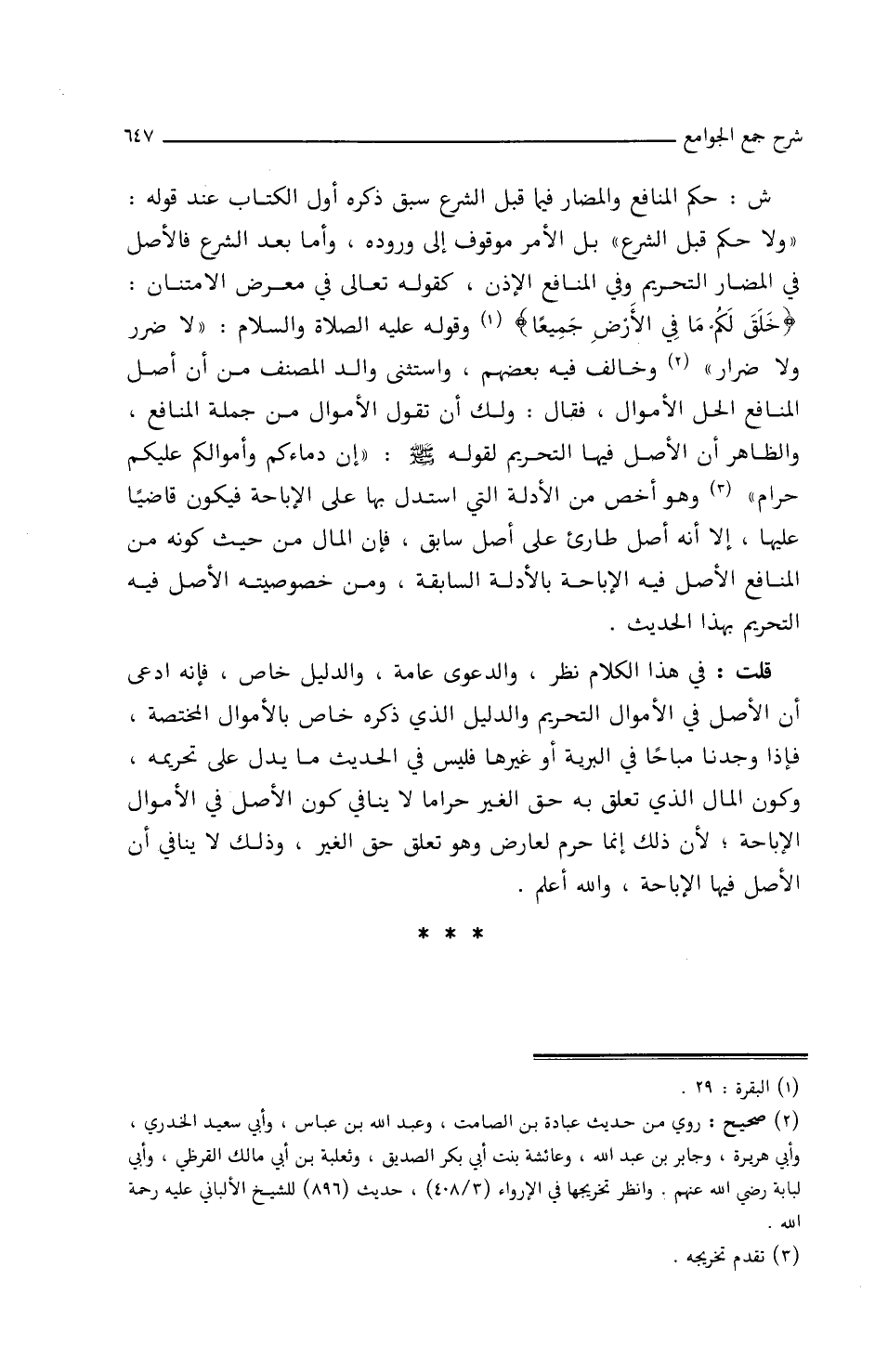 قُلْتُ: فِي هذَا الكلاَمِ نَظَرٌ، وَالدَّعْوَى عَامَّةٌ، وَالدَّلِيلُ خَاصٌّ فإِنَّه ادَّعَى أَنَّ الأَصْلَ فِي الأَموَالِ التَّحْرِيمُ وَالدَّلِيلُ الذي ذَكَرَهُ خَاصٌّ بِالأَموَالِ المختصَّةِ، فإِذَا وَجَدْنَا مُبَاحًا فِي البَرِّيَّةِ أَو غيرِهَا فَلَيْسَ فِي الحديثِ مَا يَدُلُّ علَى تحريمِهِ، وكونُ المَالِ الذي تعلَّقَ بِهِ حقُّ الغيرِ حرَامًا لاَ يُنَافِي كَوْنَ الأَصْلِ فِي الأَموَالِ الإِبَاحةَ؛ لأَنَّ ذَلِكَ إِنَّمَا حُرِّمَ لعَارضٍ وهو تعلُّقُ حقِّ الغيرِ، وذلك لاَ ينَافِي أَنَّ الأَصْلَ فِيهَا الإِبَاحةُ، وَاللَّهُ أَعْلَمُ.