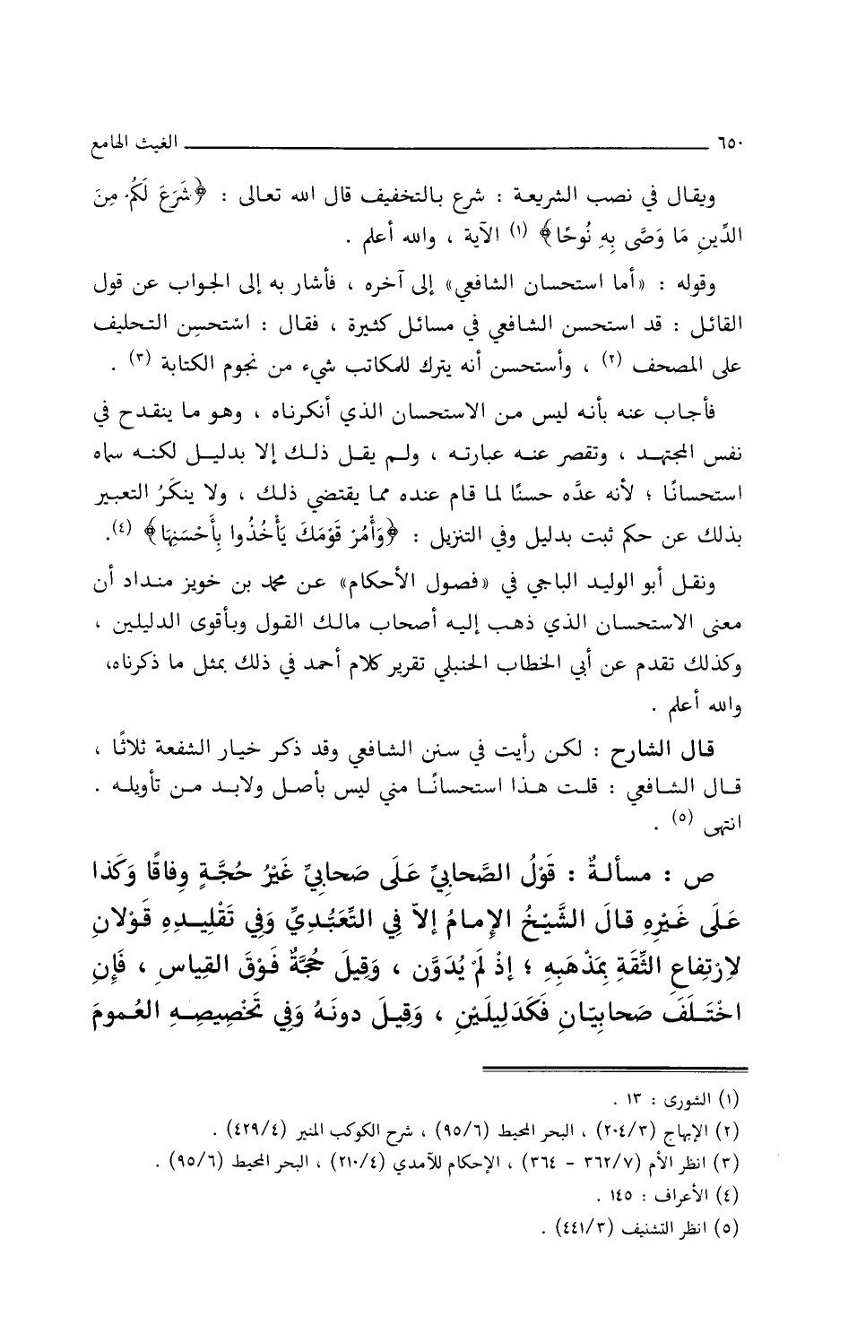 وَقَوْلُهُ: (أَمَا اسْتِحْسَانُ الشَّافِعِيِّ) إِلَى آخرِهِ، فأَشَارَ بِهِ إِلَى الجوَابِ عَن قَوْلِ القَائلِ: قَد اسْتَحْسَنَ الشَّافِعِيُّ فِي مَسَائِلَ كثيرةٍ، فقَالَ: أَسْتَحْسِنُ التَّحْلِيفَ علَى المصحفِ، وأَستحسنُ أَنْ يُتْرَكَ للمَكَاتَبِ شَيْءٌ من نجومِ الكتَابةِ.