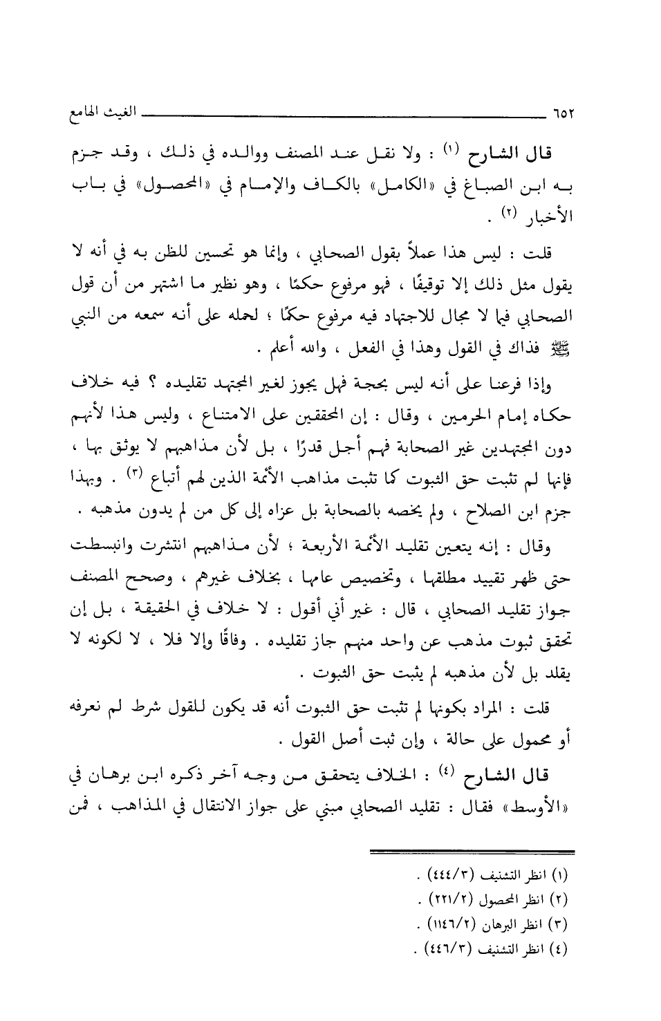 وقَالَ: إِنَّهُ يَتَعَيَّنُ تقليدُ الأَئِمَّةِ الأَربعةِ؛ لأَنَّ مَذَاهِبَهم انتشََرَتْ وَانبَسَطَتْ حتَّى ظَهَرَ تقييدُ مُطْلَقِهَا، وتخصيصُ عَامِّهَا، بِخلاَفِ غيرِهم، وصَحَّحَ المُصَنِّفُ جَوَازَ تقليدِ الصَّحَابِيِّ، قَالَ: غَيْرَ أَنِّي أَقولُ: لاَ خِلاَفَ فِي الحقيقةِ، بَلْ إِنَّ تَحَقُّقَ ثُبُوتِ مذهبٍ عَنْ وَاحدٍ مِنْهُم جَازَ تقليدُهُ./ (١٦٢/ب/د) وِفَاقًا وإِلاَّ فلاَ، لاَ لِكَوْنِهِ لاَ يُقَلَّدُ؛ بَلْ لأَنَّ مذهبَهُ لَمْ يَثْبُتْ حَقَّ الثُّبُوتِ.