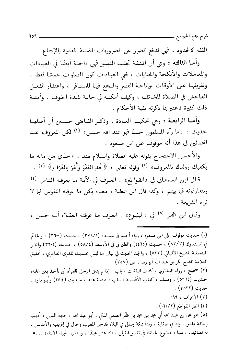 وأَمَّا الرَّابعةُ: وهي تحكيمُ العَادةِ، وذَكَرَ القَاضِي حُسَيْنُ أَنَّ أَصلَهَا حديثُ: (مَا رَآهُ المُسْلِمُونَ حَسَنًا فَهُوَ عِنْدَ اللَّهِ حَسَنٌ) لَكِنَّ المَعْرُوفَ عِنْدَ المُحَدِّثِينَ فِي هذَا أَنَّهُ موقوفٌ علَى ابْنِ مَسْعُودٍ.