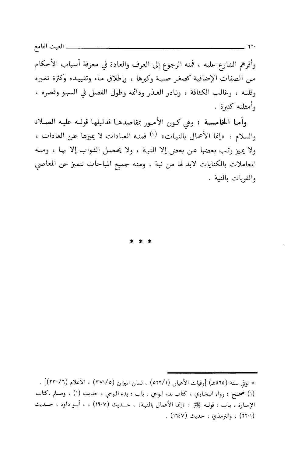 وأَمَّا الخَامسةُ: وهي كَوْنُ الأُمُورِ بِمقَاصدِهَا فدليلُهَا قَوْلُهُ عَلَيْهِ الصَّلاَةُ وَالسَّلاَمُ: ((إِنَّمَا الأَعْمَالُ بِالنِّيَّاتِ)) فَمِنْهُ العبَادَاتُ لاَ يُمَيِّزُهَا عَنِ العَادَاتِ، ولاَ يُمَيِّزُ رُتَبَ بعضِهَا عَنْ بَعْضٍ إِلَّا النِّيَّةُ، ولاَ يَحْصُلُ الثّوَابُ إِلاَّ بِهَا، ومِنْهُ المُعَامَلاَتُ بِالكنَايَاتِ، لاَ بُدَّ لَهَا مِنْ نِيَّةٍ، ومِنْهُ جَمِيعُ المُبَاحَاتِ تَتَمَيَّزُ عَنِ المَعَاصِي وَالقُرُبَاتِ بِالنِّيَّةِ.
