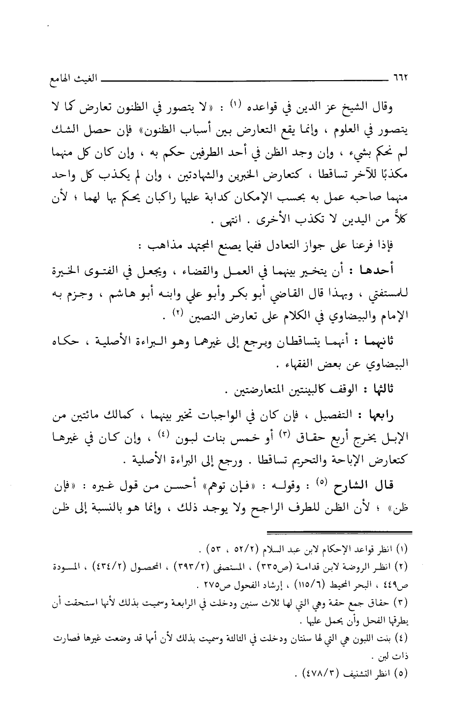 وقَالَ الشَّيْخُ عِزُّ الدِّينِ فِي قوَاعدِه: (لاَ يُتَصَوَّرُ فِي الظّنُونِ تعَارضٌ كَمَا لاَ يُتَصَوَّرُ فِي العلومِ، وإِنَّمَا يَقَعُ التّعَارضُ بَيْنَ أَسبَابِ الظُّنونِ) فَإِنْ حَصَلَ الشّكُّ لَمْ نَحْكُمْ بِشَيْءٍ، وإِنْ وُجِدَ الظّنُّ فِي أَحَدِ الطّرفِيْنِ حُكِمَ بِهِ، وإِنْ كَانَ كُلٌّ مِنْهُمَا مُكَذِّبًا لِلآخَرِ تَسَاقَطَا، كَتعَارضِ الخَبَرَيْنِ، وَالشّهَادَتَيْنِ، وإِنْ لَمْ يُكَذِّبْ كُلُّ وَاحِدٍ مِنْهُمَا صَاحِبَهُ عُمِلَ بِهِ بِحَسَبِ الإِمكَانِ كَدَابَّةٍ عَلَيْهَا رَاكبَانِ يُحْكَمُ بِهِمَا لهمَا؛ لأَنَّ كُلاًّ مِنَ اليَدَيْنِ لاَ تُكَذِّبُ الأُخْرَى. انْتَهَى.