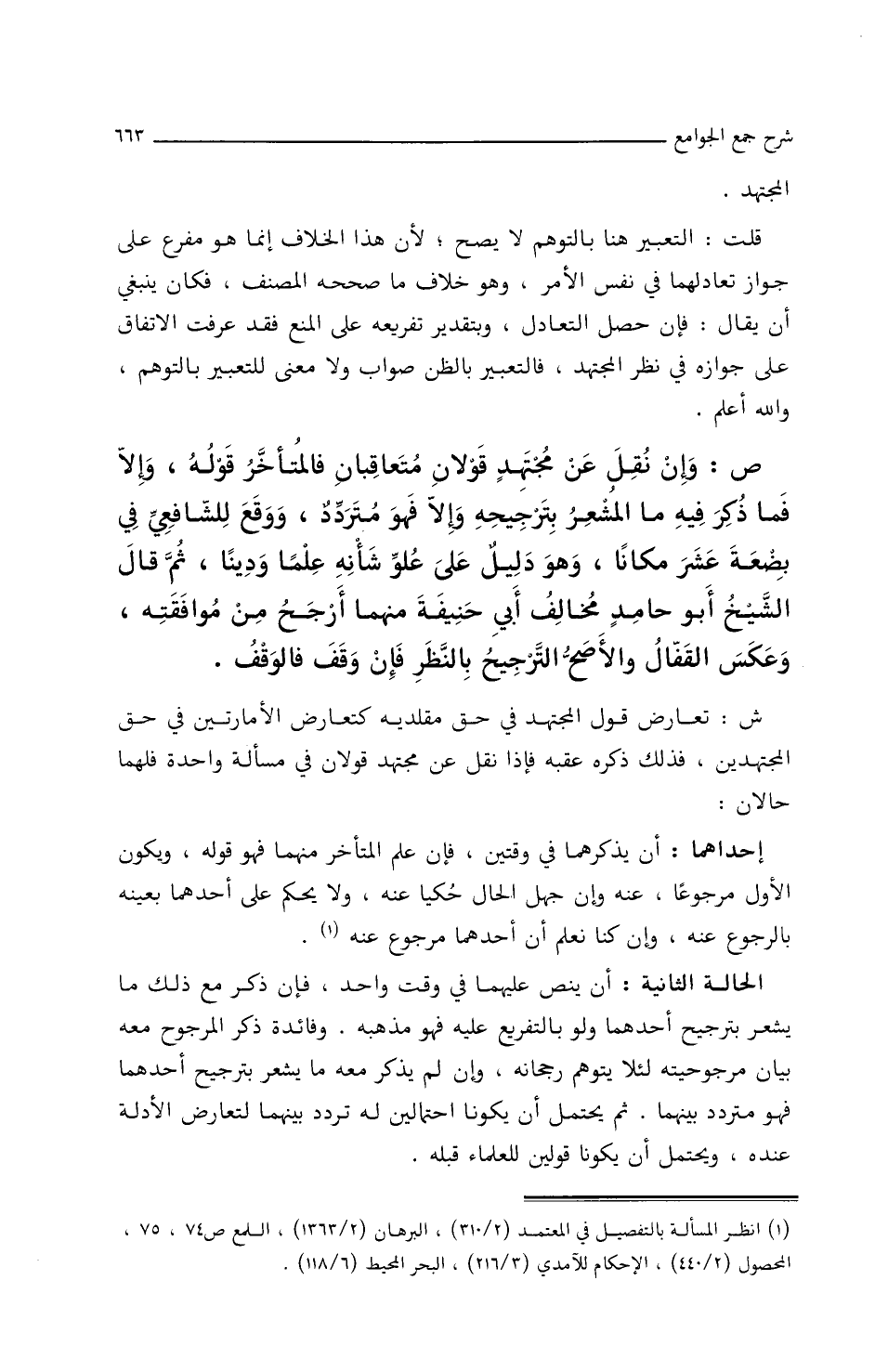 ش: تَعَارُضُ قَوْلِ المُجْتَهِدِ فِي حَقِّ مُقَلِّدِيهِ كتعَارضِ الأَمَارتَيْنِ فِي حَقِّ المُجْتَهدِينَ؛ فَلِذلك ذَكَرَه عَقِبَه، فإِذَا نُقِلَ عَنْ مُجْتَهِدٍ قولاَنِ فِي مسأَلةٍ وَاحدةٍ فَلَهُمَا حَالانِ.