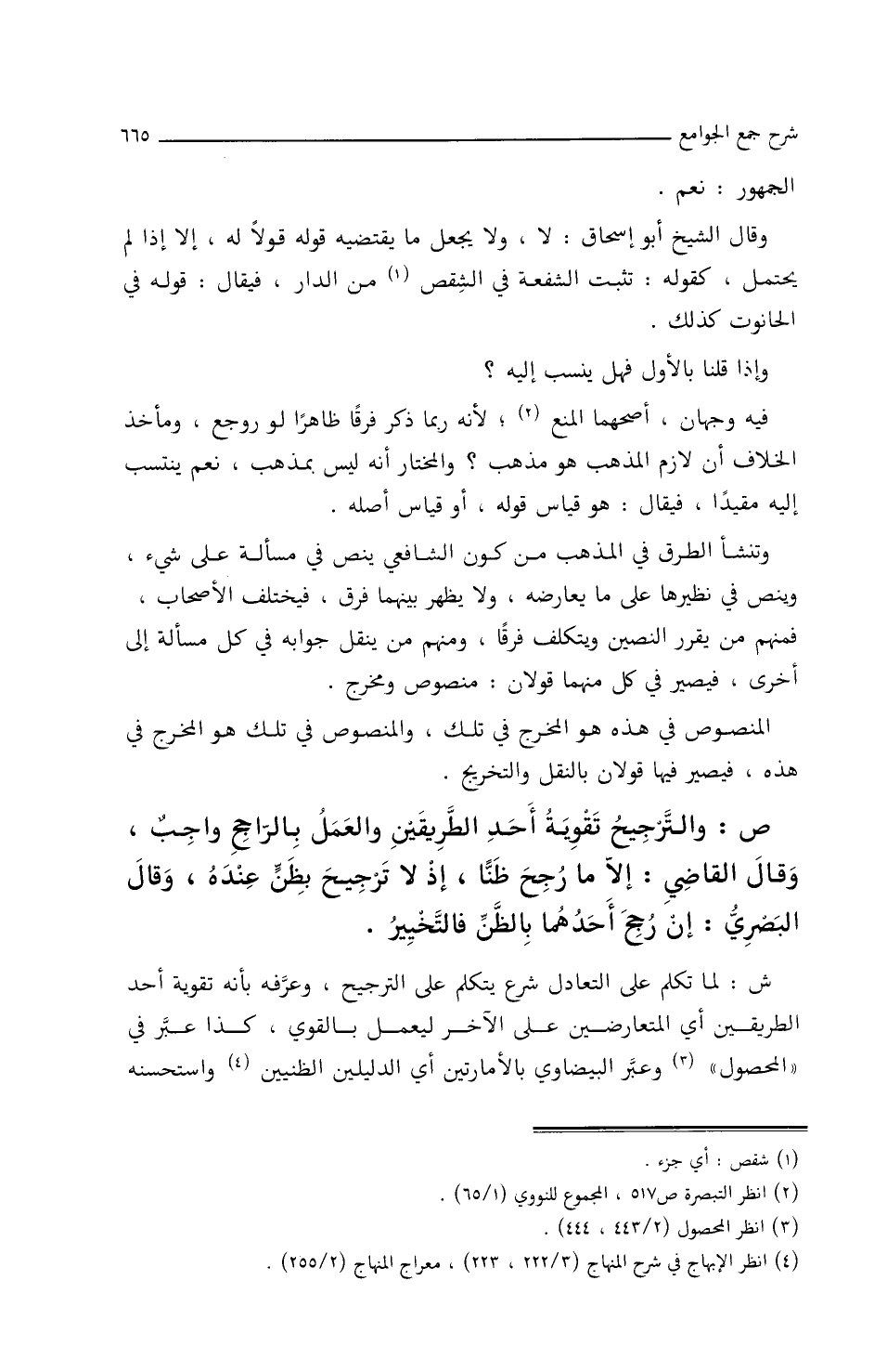 ش: لمَا تَكَلَّمَ علَى التّعَادُلِ شَرَعَ يتكلَّمُ علَى التَّرْجِيحِ، وعرَّفَهُ بأَنَّهُ/ (١٦٦/أَ/د) تقويةُ أَحدِ الطّريقينِ أَي: المتعَارضِينَ علَى الآخرِ؛ لِيعملَ بِالقويِّ، كَذَا عبَّرَ فِي (المَحْصُولِ) وعبَّرَ البَيْضَاوِيُّ بِالأَمَارتينِ؛ أَي: الدَّلِيلينِ الظَّنِّيَّيْنِ، وَاستحسنَه