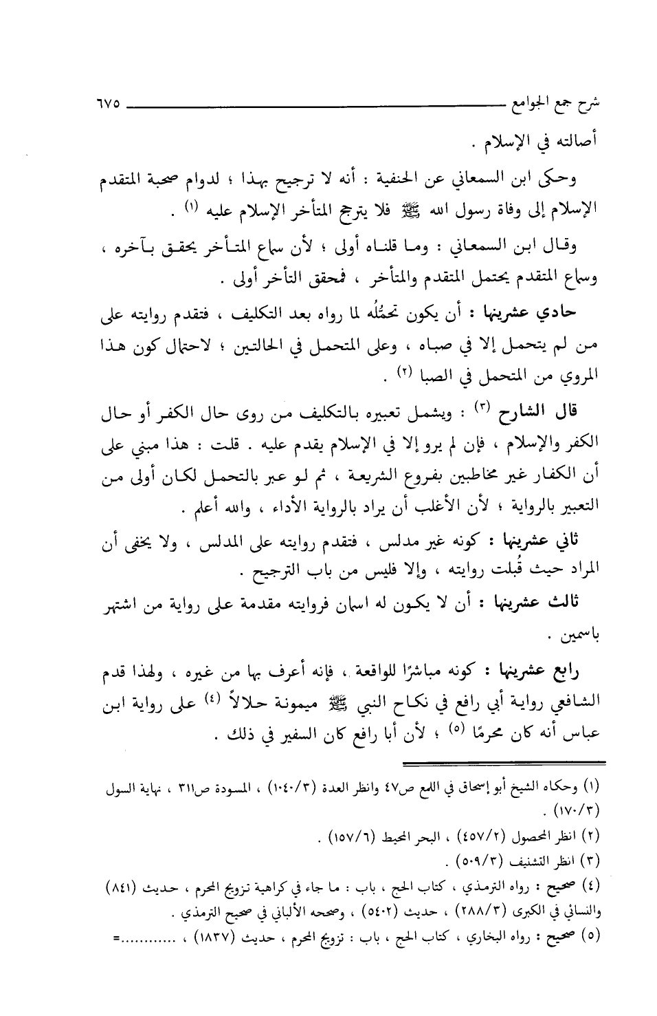 رَابعُ عشرينِهَا: كَوْنُهُ مبَاشرًا للوَاقعةِ فإِنَّه أَعرفُ بِهَا من غيرِه، ولهذَا قدَّمَ الشَّافِعِيُّ روَايةَ أَبِي رَافعٍ فِي نِكَاحِ النَّبِيِّ صَلَّى اللَّهُ عَلَيْهِ وسَلَّمَ ميمونةَ حلاَلًا علَى روَايةِ ابْنِ عبَّاسٍ أَنَّهُ كَانَ مُحْرِمًا/ (١٦٨/ب/د) لأَنَّ أَبَا رَافِعَ كَانَ السّفِيرُ فِي ذلك.