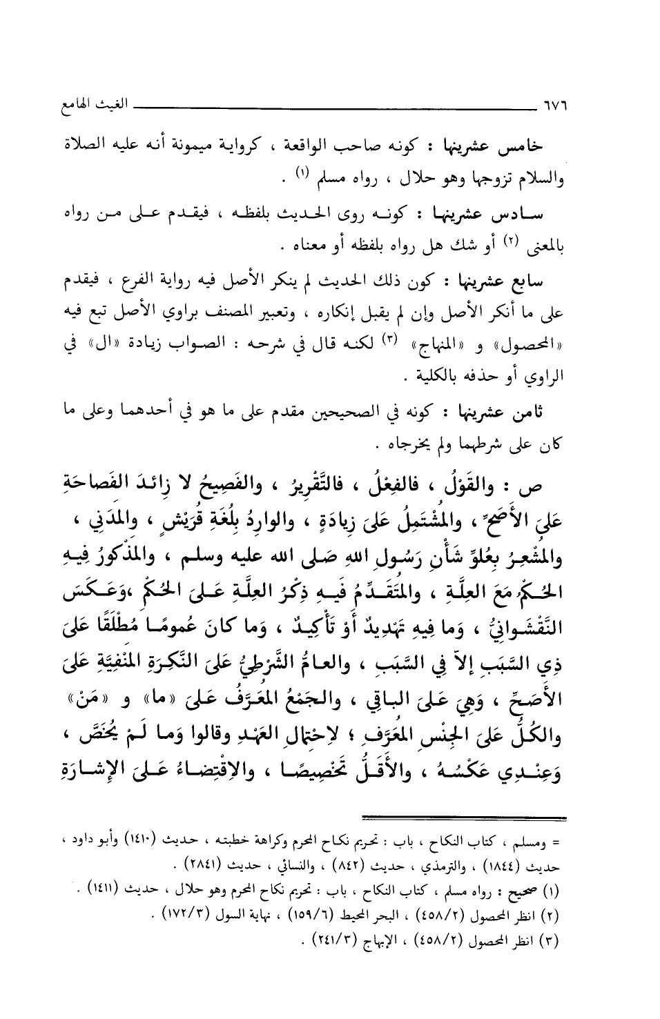 ص: وَالقولُ، فَالفعلُ فَالتقريرُ، وَالفصيحُ لاَ زَائدَ الفصَاحةِ علَى الأَصحِّ، وَالمشتمِلُ علَى زيَادةٍ وَالوَاردُ بلغةِ قريشٍ، وَالمدنيُّ وَالمشعرُّ/ (٢٠٨/أَ/م) بِعُلُوِّ شأَنِ رسولِ اللَّه صَلَّى اللَّهُ عَلَيْهِ وسَلَّمَ وَالمذكورُ فِيهِ الحُكْمُ مَعَ العِلَّةِ، وَالمتقدِّمُ فِيهِ ذِكْرُ العِلَّةِ علَى الحُكْمِ، وعكسَ +النّقشوَانِيُّ، ومَا فِيهِ تهديدٌ أَو تأَكيدٌ، ومَا كَانَ عمومًا مُطْلَقًا علَى ذي السّببِ، إِلا فِي السَّبَبِ، وَالعَامُّ الشَّرْطِيُّ علَى النكرةِ المنفِيَّةِ علَى الأَصحِّ، وهي علَى البَاقي، وَالجمعُ المعرَّفُ علَى (مَا) و (من) وَالكلُّ علَى الجنسِ المعرَّفِ لاحتمَالِ العَهْدِ، وقَالُوا ومَا لَمْ يَخُصَّ وعندي عكسُه، وَالأَقلُّ تخصيصًا وَالاقتضَاءُ علَى الإِشَارةِ