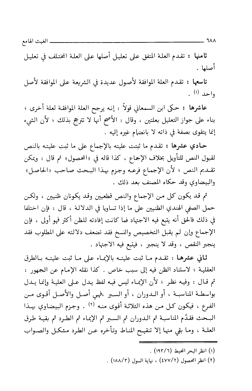 حَادي عشرِهَا: تُقَدَّمُ مَا ثَبَتَتْ عِلِّيَّتُهُ بِالإِجمَاعِ علَى مَا ثَبَتَتْ عِلِّيْتُه بِالنَّصِّ لقبولِ النَّصِّ للتأَويلِ بخلاَفِ الإِجمَاعِ، كَذَا قَالَه فِي (المَحْصُولِ) ثُمَّ قَالَ: ويُمْكِنُ تقديمُ النَّصِّ؛ لأَنَّ الإِجمَاعَ فرعُه، وجزَمَ بهذَا البحثِ صَاحبُ (الحَاصِلِ) وَالبَيْضَاوِيُّ وَقَدْ حَكَاهُ المُصَنِّفُ بعدَ ذلك.