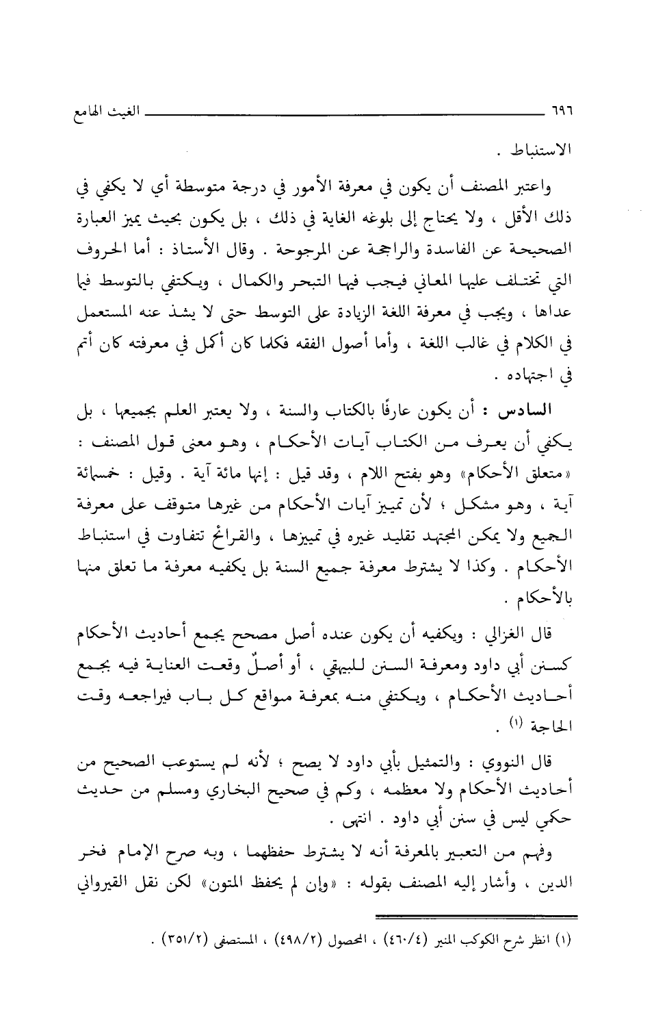قَالَ الغَزَالِيُّ: ويكفِيه أَنْ يَكُونَ عندَه أَصلٌّ مصحِّحٌ يجمَعُ أَحَاديثَ الأَحكَامِ/ (٢١٥/أَ/م) كسُنَنِ أَبِي دَاوُدَ ومعرفةِ السُّنَنِ للبيهقِيِّ، أَو أَصلُ وقَعَتِ العنَايةُ فِيهِ بِجَمْعِ أَحَاديثِ الأَحكَامِ، ويكتفِي مِنْهُ بمعرفةِ موَاقِعَ كلِّ بَابٍ فَيُرَاجِعُه وقتَ الحَاجةِ.