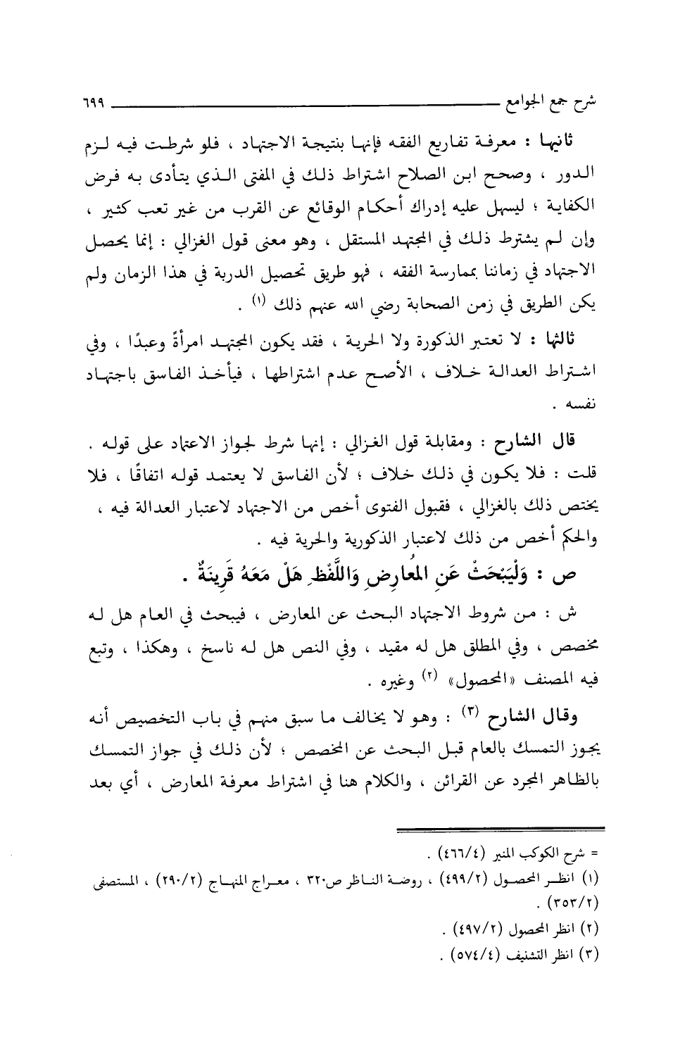 ش: من شُرُوط ِالاجْتِهَادِ البحثُ عَنِ المعَارضِ، فَيَبْحَثُ فِي العَامِّ هَلْ لَهُ مُخَصَّصٌ وفِي المُطْلَقِ هَلْ لَهُ مُقَيَّدٌ، وفِي النَّصِّ هَلْ لَهُ نَاسِخٌ، وهكذَا، وتَبِعَ فِيهِ المُصَنِّفُ (المَحْصُولَ) وَغَيْرَه.