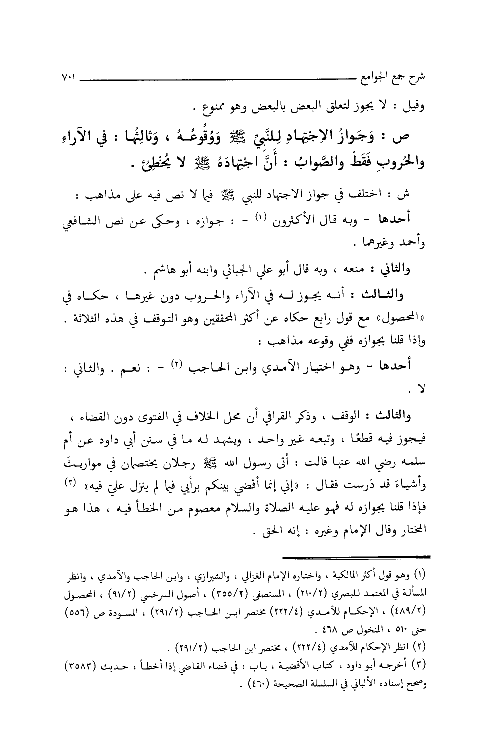 ش: اخْتُلِفَ فِي جَوَازِ الاجْتِهَادِ للنبيِّ صَلَّى اللَّهُ عَلَيْهِ وسَلَّمَ فِيمَا لاَ نصَّ فِيهِ علَى مَذَاهِبِ: