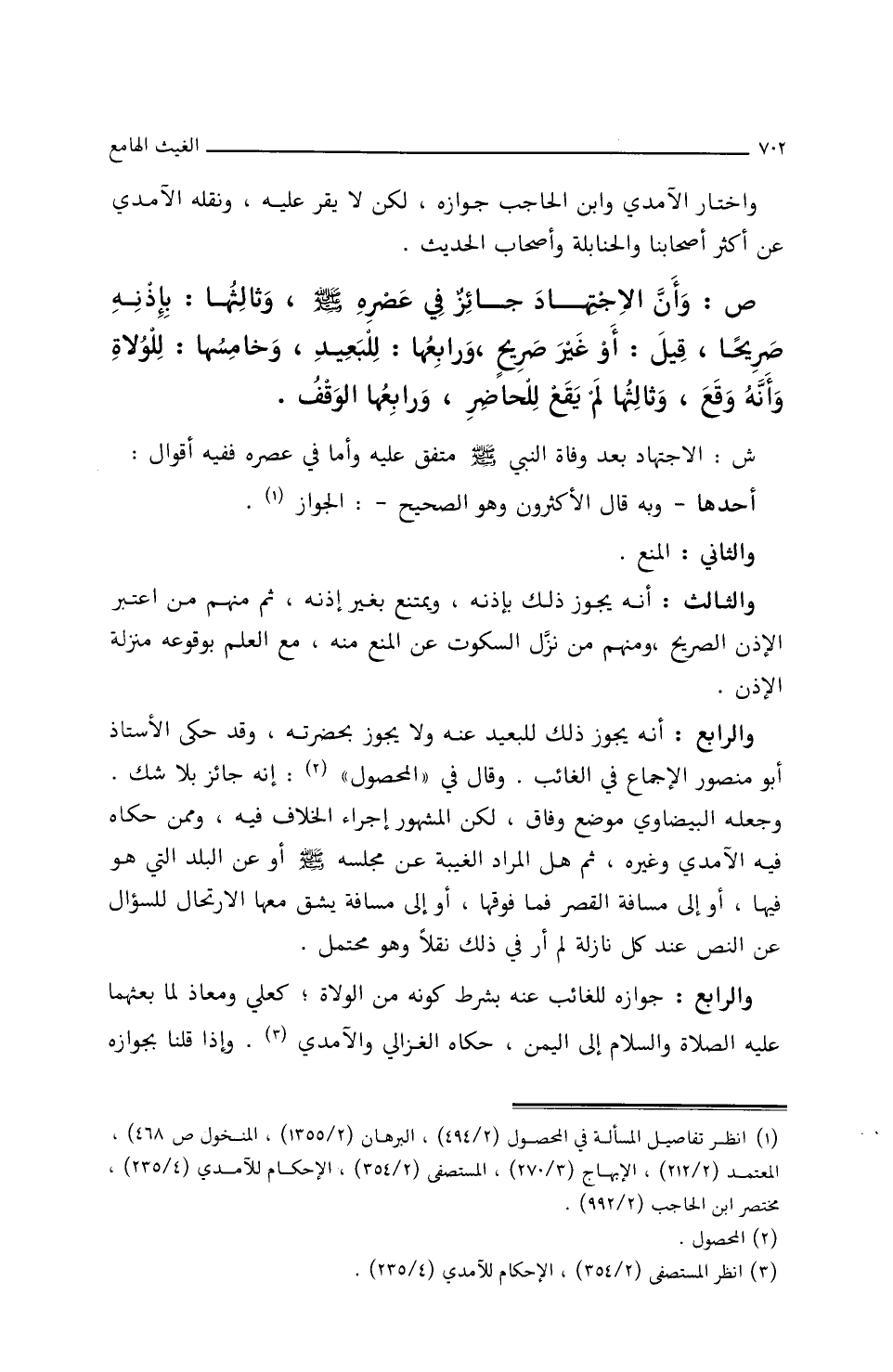 ص: وأَنَّ الاجْتِهَادَ جَائزٌ فِي عصرِه صلَى اللَّهُ عَلَيْهِ وسلَّمَ، وثَالِثُهَا: بإِذنِه صريحًا، قِيلَ: أَو غَيْر صريحٍ، ورَابِعُهَا: للبعيدِ، وخَامِسُهَا للولاَةِ، وأَنَّهُ وقَعَ، وثَالِثُهَا لَمْ يقع للحَاضرِ، ورَابعُهَا الوقفُ.