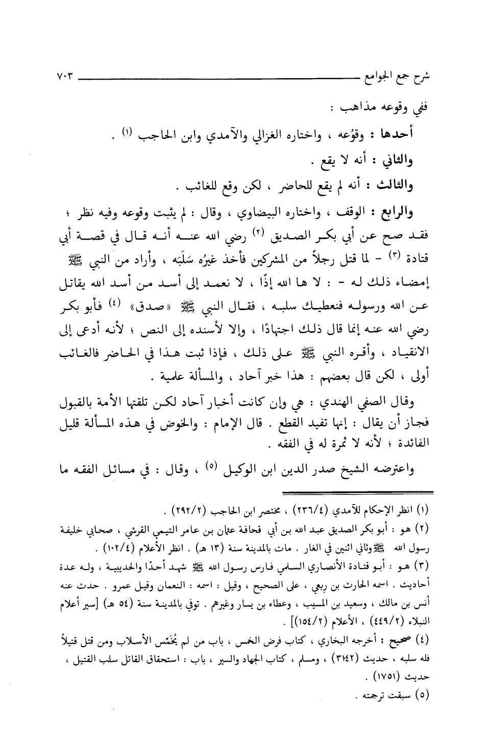 وَالرَابِعُ: الوقفُ، وَاختَارَهُ البيضَاويُّ، وقَالَ: لَمْ يَثْبُتْ وقوعُهُ وفِيهِ نَظَرٌ، فقد صحَّ عَنْ أَبِي بكرٍ الصّديقِ رضِي اللَّه عَنْهُ أَنَّهُ قَالَ فِي قصَّةِ أَبِي قتَادةَ ـ لمَا قتَل رجلاً مِنَ المشركين فأَخذَ غَيْرُه سَلَبَه، وأَرَادَ مِنَ النَّبِيِّ صَلَّى اللَّهُ عَلَيْهِ وسَلَّمَ إِمضَاءَ ذَلِكَ له: لاَ هَا اللَّه إِذًا، لاَ نعمَدُ إِلَى أَسدٍ من أَسدِ اللَّهِ يقَاتِلُ عَنِ اللَّه ورسولِهِ فنعطيكَ سَلَبَهُ، فقَالَ النَّبِيُّ صلَى اللَّه عَلَيْهِ وسلم: ((صَدَقَ)) فأَبُو بَكْرٍ رضِي اللَّهُ عَنْهُ إِنمَا قَالَ ذَلِكَ اجتهَادًا وإِلاَّ لأَسندَهُ إِلَى النصِّ؛ لأَنَّهُ أَدعَى إِلَى الانقيَادِ، وأَقرَّهُ النَّبِيُّ صَلَّى اللَّهُ عَلَيْهِ وسَلَّمَ علَى ذَلِكَ، فإِذَا ثَبَتَ هذَا فِي الحَاضرِ فَالغَائبُ أَولَى، لكن قَالَ بعضُهُم: هذَا خبرُ آحَادٍ، وَالمَسْأَلَةُ عِلْمِيَّةُ.