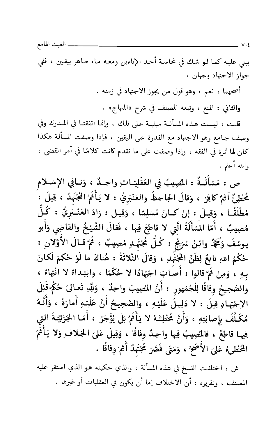 ص: مسأَلةٌ: المُصِيبُ فِي العَقْلِيَّاتِ وَاحِدٌ، ونَافِي الإِسلاَمَ مُخْطِئٌ آثِمٌ كَافِرٌ، وقَالَ الجَاحظُ وَالعنبريُّ، لاَ يأَثَمُ المجتهِدُ، قِيلَ: مُطْلَقًا، وَقِيلَ: إِن كَانَ مُسْلِمًا، وَقِيلَ: زَادَ العنبريُّ: كلٌّ مصيبٌ، أَمَّا المَسْأَلَةُ التي لاَ قَاطِعَ فِيهَا، فقَالَ الشَّيْخُ وَالقَاضِي وأَبُو يُوسُفَ ومُحَمَّدُ وَابنُ/ (٢١٧/ب/م) سُرَيْجٍ: كلُّ مجتهدٍ مصيبٌ، ثُمَّ قَالَ الأَوَّلاَنِ: حُكْمُ اللَّهِ تَابِعٌ لظنِّ المجتهِدِ، وقَالَ الثّلاَثةُ: هنَاك مَا لو حَكَمَ لكَانَ بِهِ، ومِنْ ثَمَّ قَالُوا: أَصَابَ اجتهَادًا لاَ حُكْمًا، وَابتدَاءً لاَ انتهَاءَ وَالصَّحِيحُ وفَاقًا للجمهورِ: أَنَّ المصيبَ وَاحدٌ، ولِلَّهِ تعَالَى حُكْمٌ قَبْلَ الاجتهَادِ، قِيلَ: لاَ دَلِيلَ عَلَيْهِ، وَالصَّحِيحُ أَنَّ عَلَيْهِ أَمَارةٌ، وأَنَّهُ مُكَلَّفٌ بإِصَابتِه، وأَنَّ مُخْطِئَهُ لاَ يأَثَمُ بَلْ يُؤْجَرُ، أَمَّا الجزئيَّةُ التي فِيهَا قَاطِعٌ، فَالمُصِيبَ فِيهَا وَاحدٌ وِفَاقًا، وَقِيلَ علَى الخِلاَفِ، ولاَ يأَثَمُ المخطئُ علَى الأَصحِّ، ومتَى قَصَّرَ مُجْتَهِدٌ أَثِمَ وفَاقًا.
