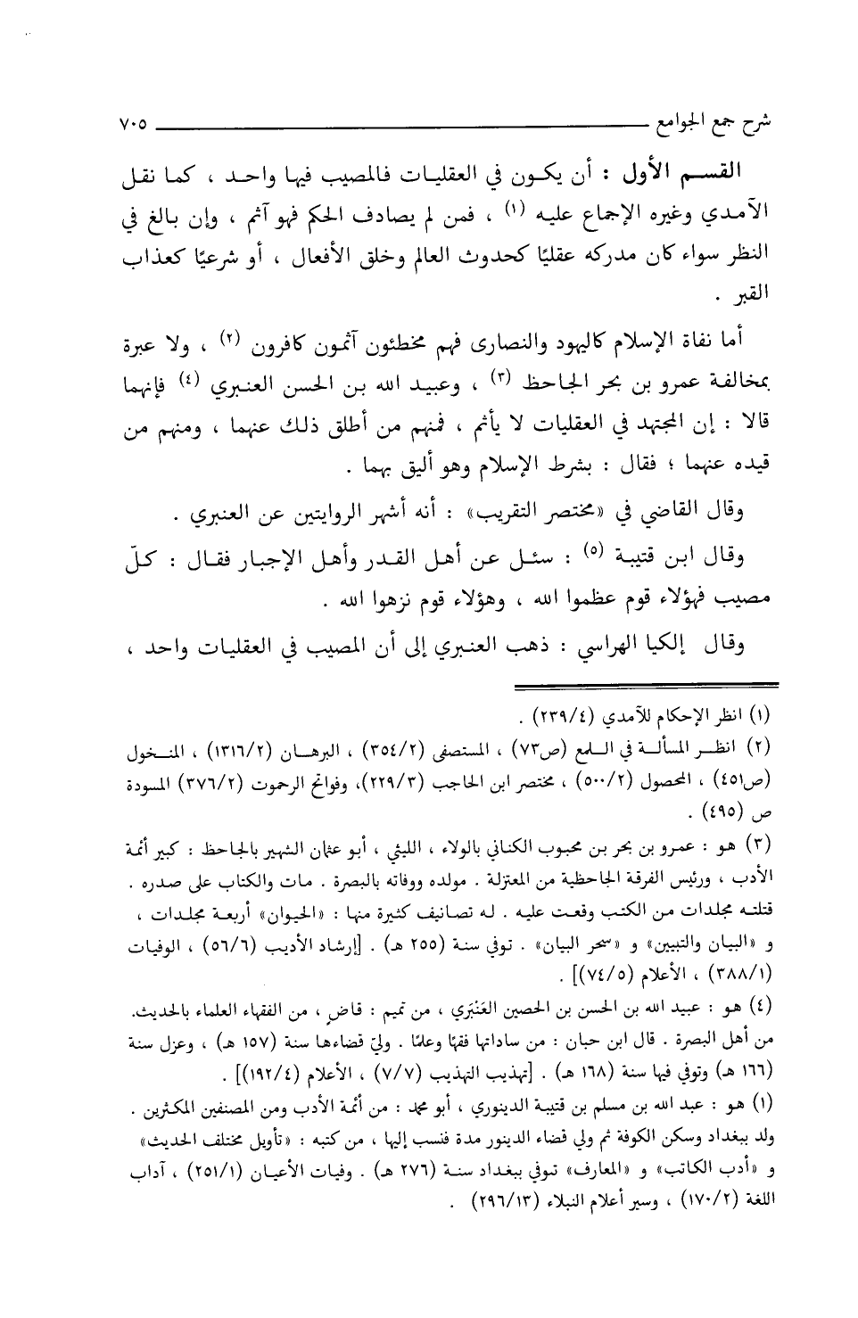 أَمَا +نفاةُ الإِسلاَمِ كَاليهودِ وَالنصَارَى، فَهُمْ مُخْطِئُونَ آثِمُونَ كَافرونَ، ولاَ عبرةَ بمخَالفةِ عمرِو بْنِ بحرٍ الجَاحظِ، وعبيدِ اللَّهِ بْنِ الحسنِ العنبريِّ فإِنَّهُمَا قَالا: إِنَّ المُجْتَهِدَ فِي العَقْليَّاتِ لاَ يأَثَمُ، فمنهم من أَطلقَ ذَلِكَ عَنْهُمَا، وَمِنْهُم مَنْ قيَّدَهُ عَنْهُمَا، فقَالَ: بشرطِ الإِسلاَمِ وهو أَليقُ بهمَا.