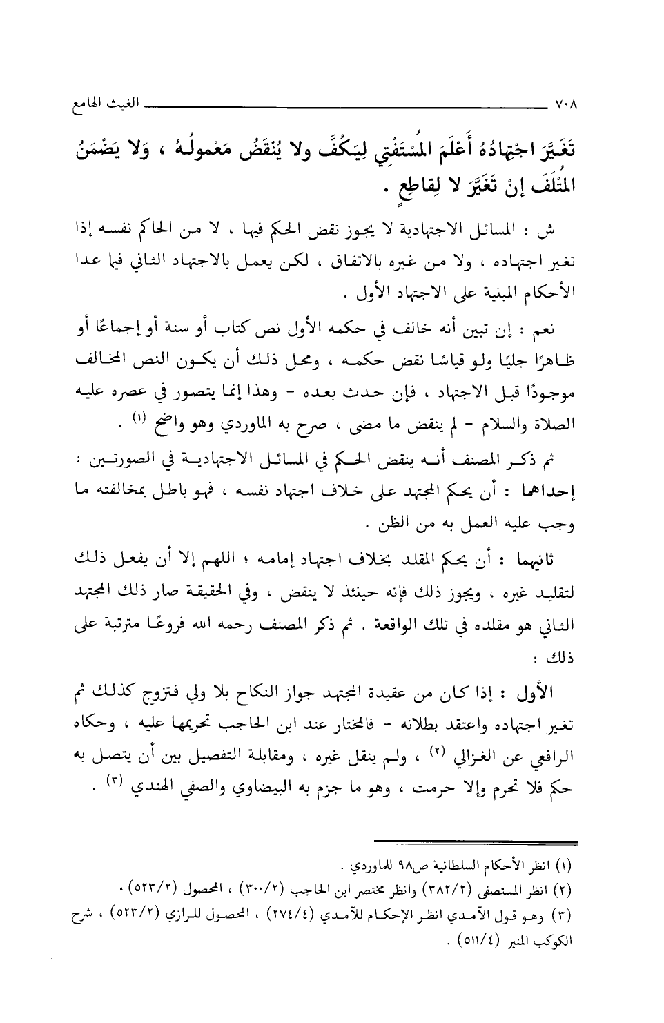 ش: المَسَائِلُ الاجتهَاديَّةُ لاَ يَجُوزُ نقضُ الحُكْمِ فِيهَا، لاَ مِنَ الحَاكمِ نفسِه إِذَا تغيَّرَ اجتهَادُه، ولاَ من غَيْرِه بِالاتِّفَاقِ، لكنْ يُعْمَلُ بِالاجْتِهَادِ الثَّانِي فِيمَا عدَا الأَحكَامَ المَبْنِيَّةَ علَى الاجْتِهَادِ الأَوَّلَ.