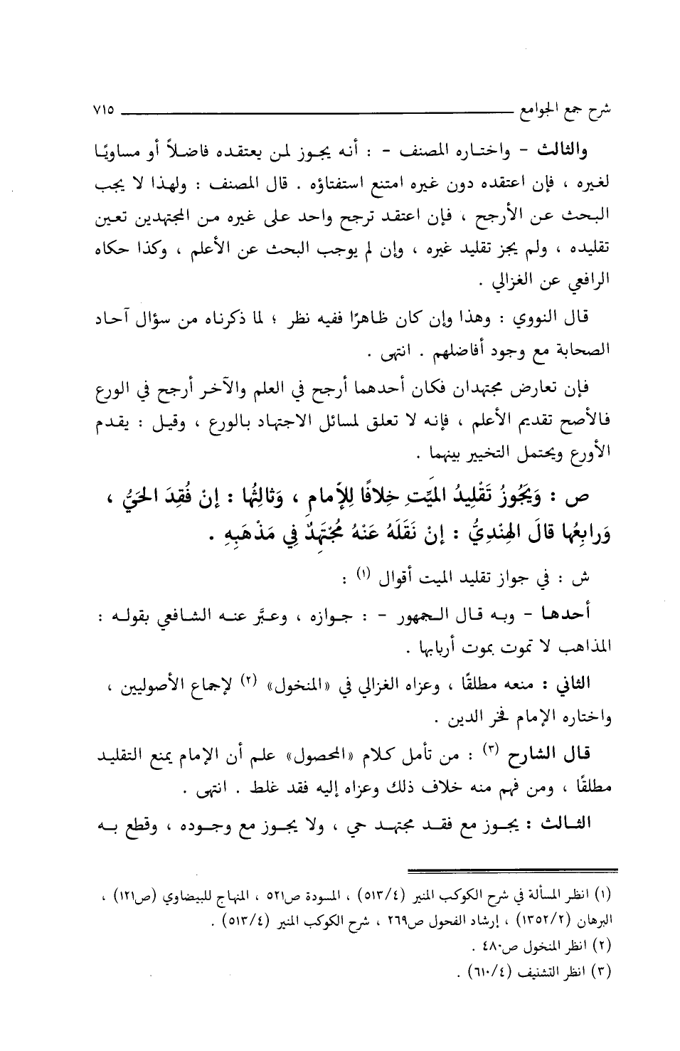 وقَالَ الشَّارِحُ: مَنْ تأَمَّلَ كلاَمَ (المَحْصُولِ) عَلِمَ أَنَّ الإِمَامَ يَمْنَعُ التّقليدَ مُطْلَقًا، ومَنْ فَهِمَ مِنْهُ خِلاَفَ ذَلِكَ وعَزَاهُ إِلَيْهِ فَقَدْ غَلِطَ، انْتَهَى.