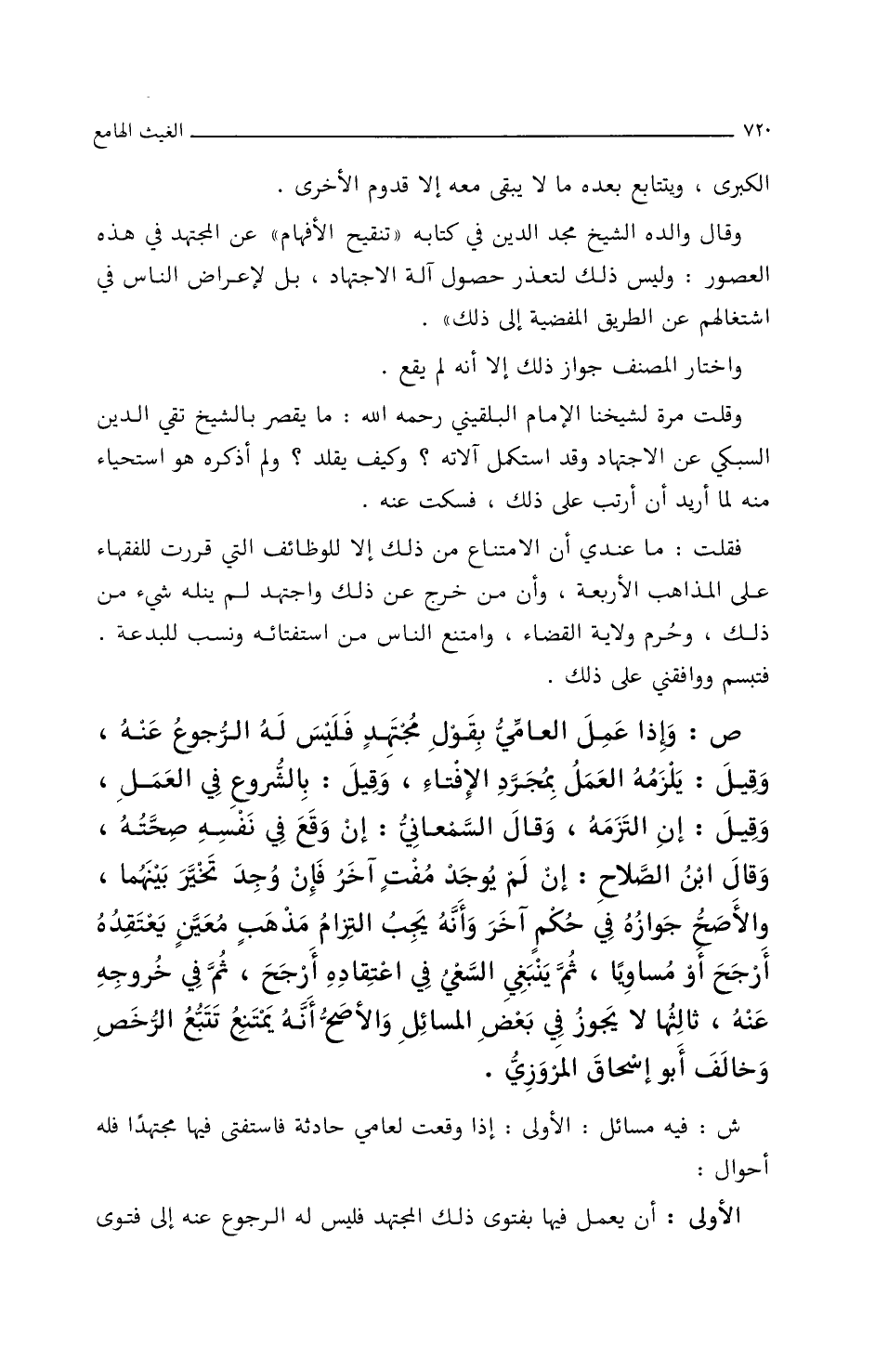 وقَالَ وَالدُه الشَّيْخُ مَجْدُ الدّينِ فِي كتَابِهِ (تَنْقِيحُ الأَفهَامِ) عَنِ المُجْتَهِد فِي هذه الأَعصَارِ: وَلَيْسَ ذَلِكَ لِتَعَذُّرِ حُصُولِ آلةِ الاجتهَادِ، بَلْ لإِعرَاضِ النَّاسِ فِي اشتغَالِهم عَنِ الطّريقِ المُفْضِيةِ إِلَى ذلكَ).