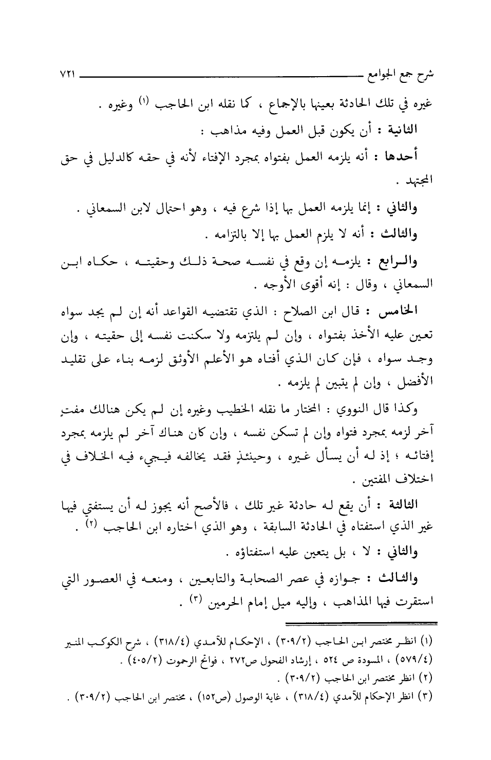 وَالثَّالِثُ: جَوَازُهُ فِي عَصْرِ الصّحَابةِ وَالتَابِعِينَ، ومَنَعَهُ فِي الأَعصَارِ التي اسْتَقَرَّتْ فِيهَا المَذَاهِبِ، وإِليه مَيْلُ إِمَامِ الحَرَمَيْنِ.
