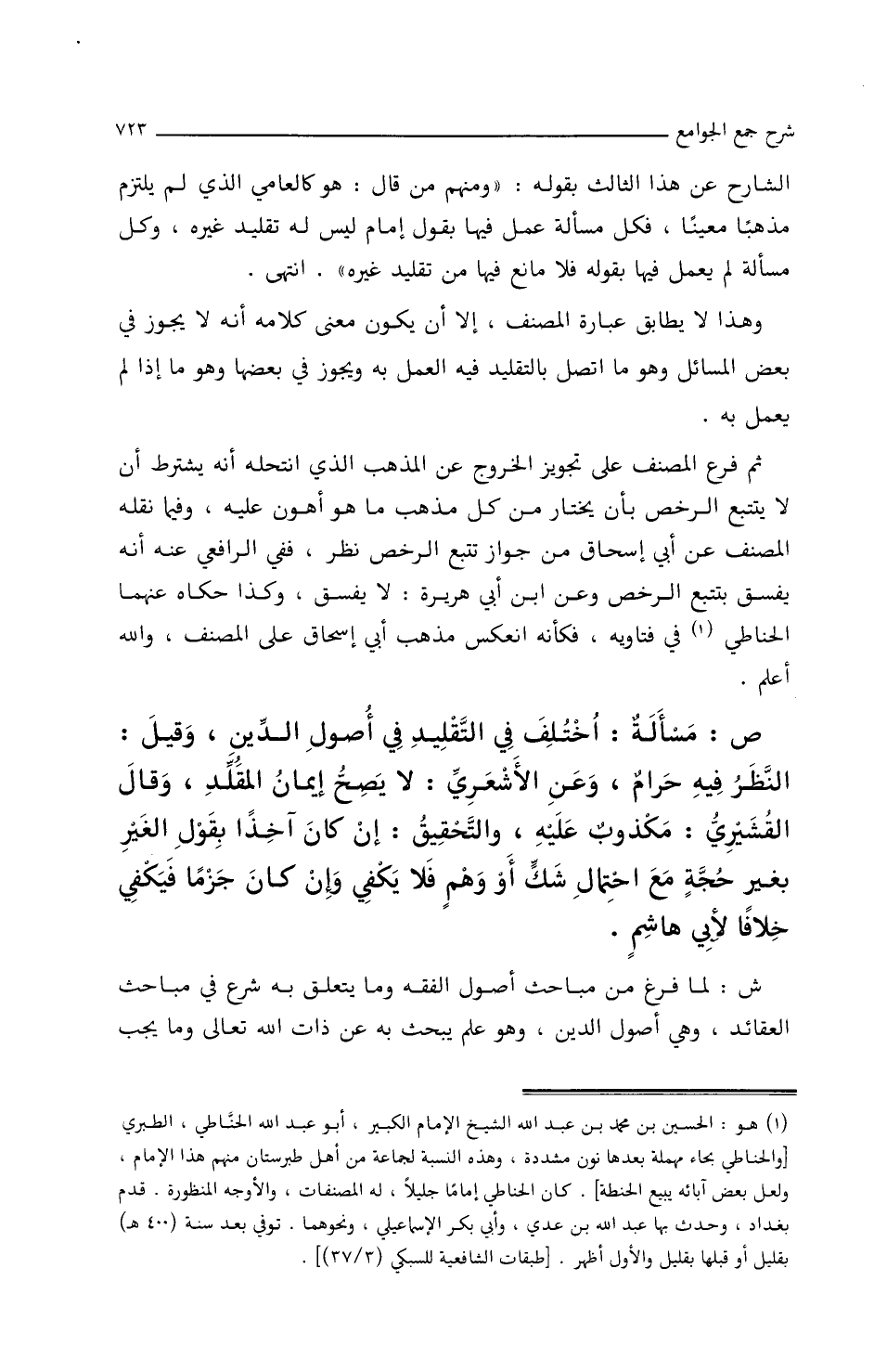 ص: مسأَلةٌ: اخْتُلِفَ فِي التّقليدِ فِي أَصولِ الدّينِ، وَقِيلَ: النّظرُ فِيهِ حرَامٌ وعن الأَشعريِّ: لاَ يصِحُّ إِيمَانُ المُقَلِّدُ، وقَالَ القُشَيِّريُّ: مكذوبٌ عَلَيْهِ، وَالتحقيقُ: إِنْ كَانَ آخِذًا بقولِ الغيرِ بِغَيْرِ حُجَّةٍ مَعَ احتمَالِ شَكٍّ أَو وَهْمٍ فَلاَ يَكْفِي وإِنْ كَانَ جَزْمًا فَيَكْفِي خِلاَفًا لأَبي هَاشِمٍ.