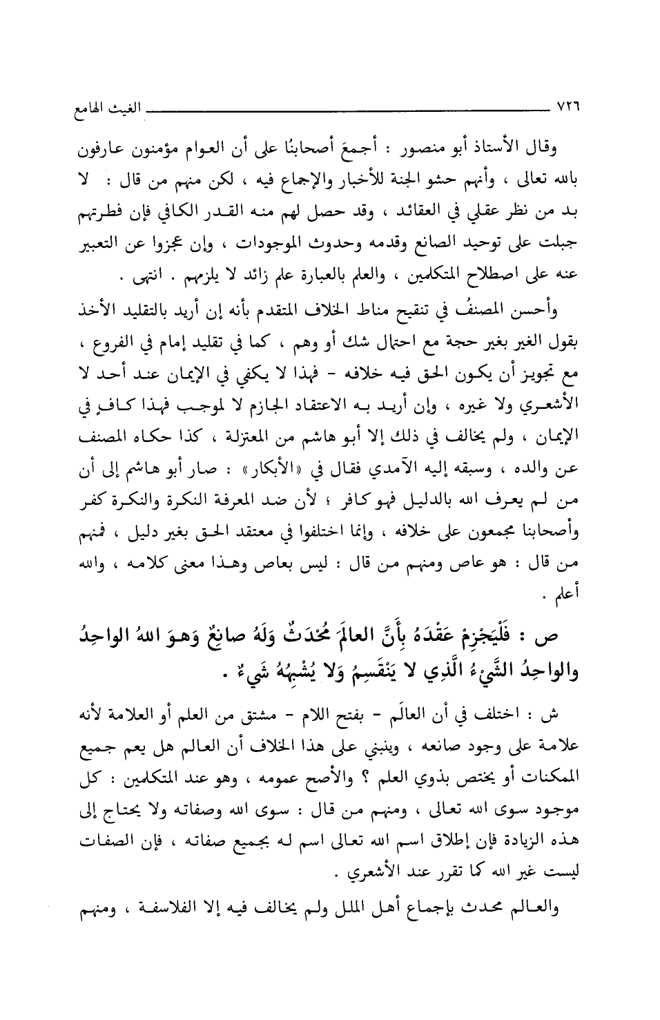 ش: اخْتُلِفَ فِي أَنَّ العَالَمَ ـ بفتحِ اللاَّمِ ـ مشتقٌ مِنَ العِلْمِ أَو العلاَمةِ/ (٢٢٥/أَ/م) لأَنَّهُ علاَمةٌ علَى وُجُودِ صَانعِه؟ ويَنْبَنِي علَى هذَا الخِلاَفِ أَنَّ العَالَمَ هَلْ يَعُمُّ جَمِيعَ الممكنَاتِ أَو يختصُّ بذوي العِلْمِ؟ وَالأَصَحَّ عمومُه، وهو عِنْدَ المتكلِّمِينَ: كلُّ مَوْجُودٍ سوَى اللَّهِ تعَالَى، وَمِنْهُم مَنْ قَالَ: سوَى اللَّهِ وصفَاتِه، ولاَ يُحْتَاجُ إِلَى هذه الزِّيَادةِ فإِنَّ إِطلاَقَ اسمِ اللَّهِ تعَالَى اسمٌ لَهُ بجميعِ صفَاتِه، فإِنَّ الصّفَاتِ ليسَتْ غَيْرَ اللَّهِ كَمَا تقرَّرَ عِنْدَ الأَشعريِّ.