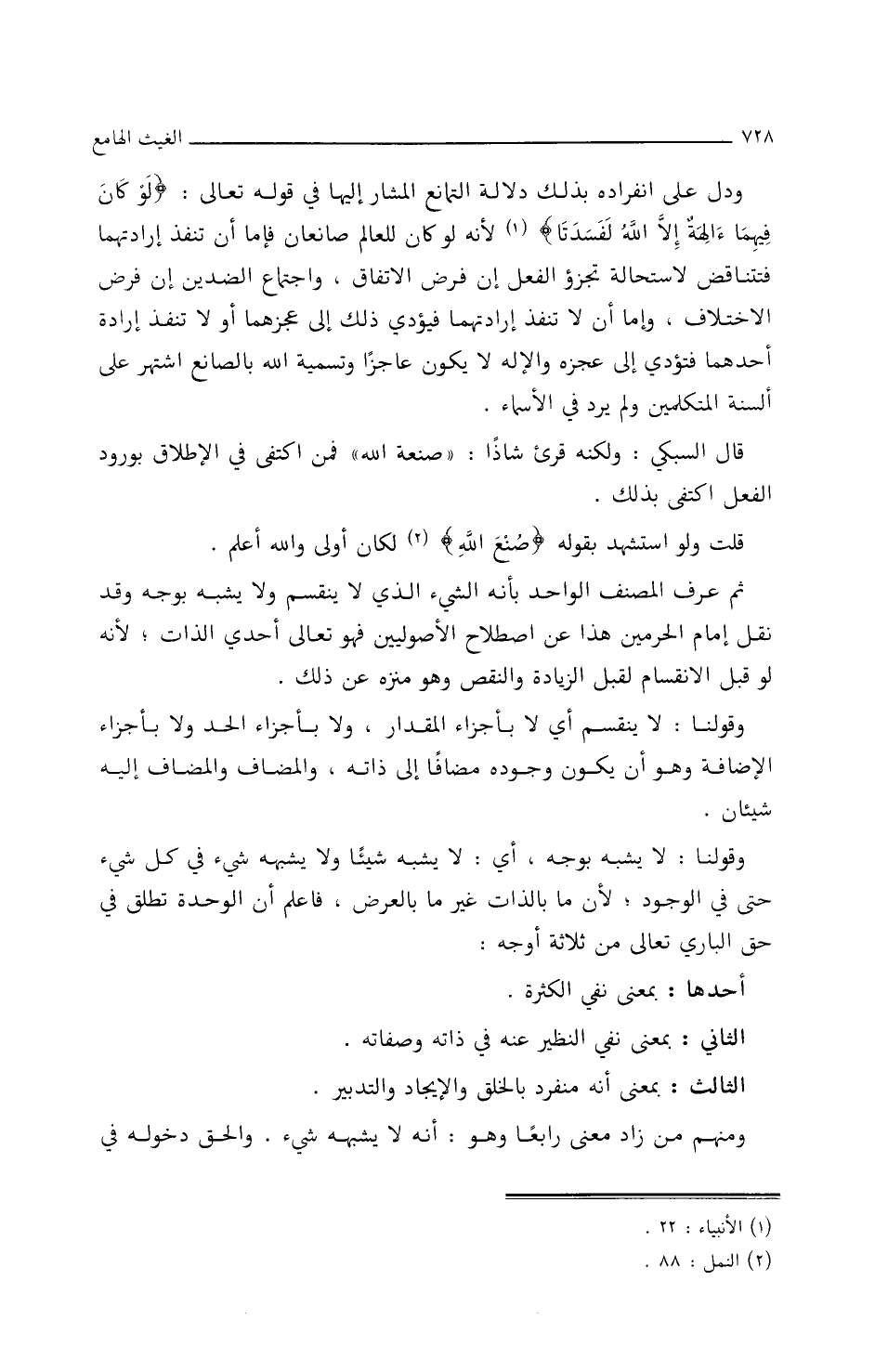 ودلَّ علَى انفرَادِهِ بِذَلِكَ دلاَلةُ التّمَانُعِ المشَارِ إِليهَا فِي قَوْلِهِ تعَالَى: {لَوْ كَانَ فِيهِمَا آلِهَةٌ إِلَّا اللَّهُ لَفَسَدَتَا} لأَنَّهُ لو كَانَ للعَالَمِ صَانعَانِ فإِمَّا أَنْ تَنْفَذَ إِرَادتُهمَا فتتنَاقضُ/ (٢٢٥/ب/م) لاستحَالةِ تَجَزُّؤِ الفعلِ إِنْ فُرِضَ الاتِّفَاقُ، وَاجتمَاعِ الضدِّينِ إِن فُرِضَ الاختلاَفُ، وإِمَا أَن لاَ تَنْفَذُ إِرَادتُهمَا فَيؤدِّي ذَلِكَ إِلَى عجزِهمَا أَو لاَ تَنْفَذُ إِرَادةُ أَحَدِهمَا فتؤدِّي إِلَى عجزِه، وَالإِلهُ لاَ يَكُونُ عَاجزًا، وتسميةُ اللَّهِ بِالصَانعِ اشْتُهِرَ علَى أَلسنةِ المُتَكَلِّمِينَ ولم يَرِدْ فِي الأَسمَاءِ.
