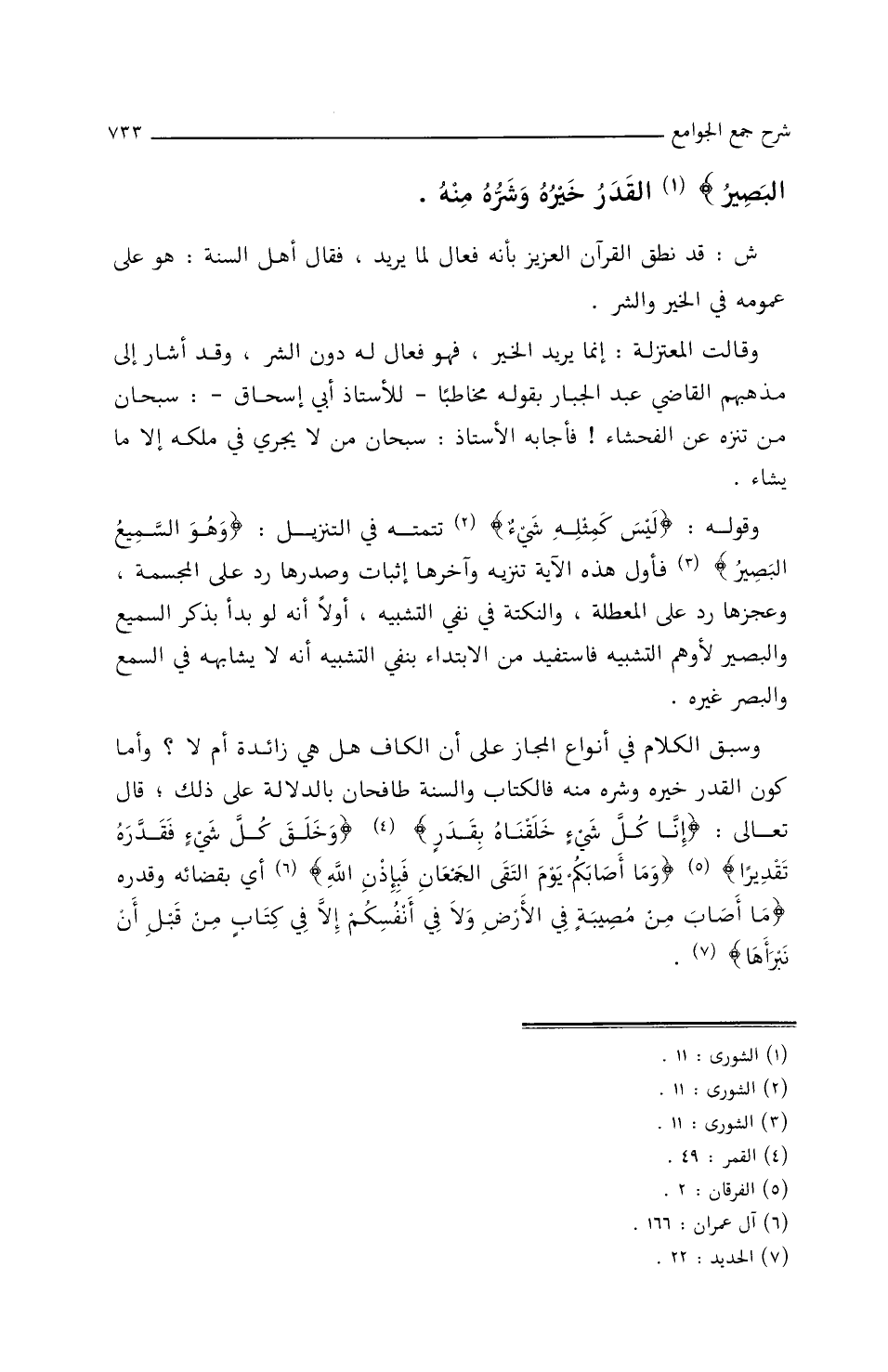 وَقَوْلُهُ: {لَيْسَ كَمِثْلِهِ شَيْءٌ} تَتِمَّتُه فِي التّنزيلِ {وَهُوَ السَّمِيعُ الْبَصِيرُ} فأَوَّلُ هذه الآيةِ تَنْزِيهٌ، وآخرُهَا إِثبَاتٌ، وصدرُهَا ردٌّ علَى المُجَسِّمَةِ، وعَجُزُهَا ردٌّ علَى المُعَطِّلَةِ، وَالنكتُةُ فِي نَفْيِ التّشبيهِ أَوَّلاً أَنَّهُ لو بدأَ بِذِكْرِ السّميعِ وَالبصيرِ لأَوْهَمَ التّشبيهَ، فَاسْتُفِيدَ مِنَ الابتدَاءِ بنفِيِ التّشبيهِ أَنَّهُ لاَ يُشَابِهُهُ فِي السَّمْعِ وَالبَصَرِ غيرُه.