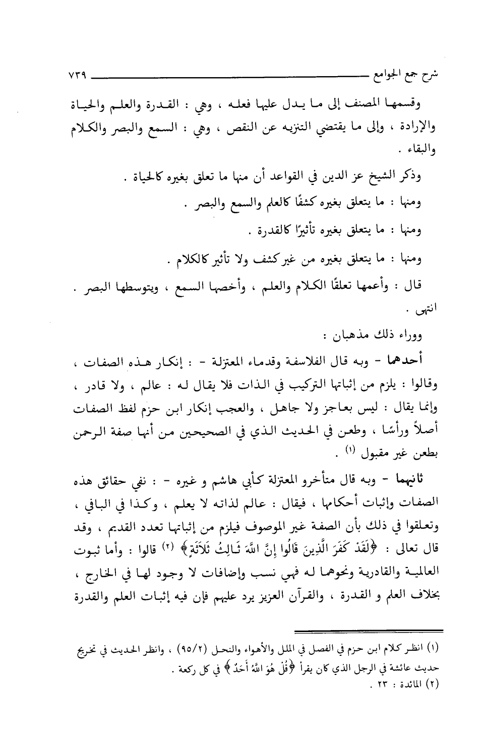 ثَانِيهُمَا ـ وَبِهِ قَالَ متأَخِّرُو المُعْتَزِلَةِ كأَبِي هَاشِمٍ وَغَيْرِه ـ: نَفْيُ حقَائقِ هذه الصّفَاتِ وإِثبَاتُ أَحكَامِهَا؛ فَيُقَالُ: عَالِمٌ لِذَاتِهِ لاَ يَعْلَمُ، وكذَا فِي البَاقي، وتَعَلَّقُوا فِي ذَلِكَ بأَنَّ الصّفَةَ غَيْرُ الموصوفُ فَيَلْزَمُ مِنْ إِثبَاتِهَا تَعَدُّدُ القديمِ، وَقَدْ قَالَ تعَالَى: {لَقَدْ كَفَرَ الذّينَ قَالُوا إِنَّ اللَّهَ ثَالِثُ ثَلاَثَةٍ} قَالُوا: وأَمَّا ثُبُوتُ العَالِمِيَّةِ وَالقَادِرِيَّةِ ونحوِهمَا لَهُ فهي نِسَبٌ وإِضَافَاتٌ لاَ وُجُودَ لَهَا فِي الخَارجِ، بِخلاَفِ العِلْمِ وَالقُدْرَةِ، وَالقرآنُ العزيزِ يَرُدُّ عَلَيْهِم فَإِنَّ فِيهِ إِثبَاتُ العِلْمِ وَالقُدْرَةِ