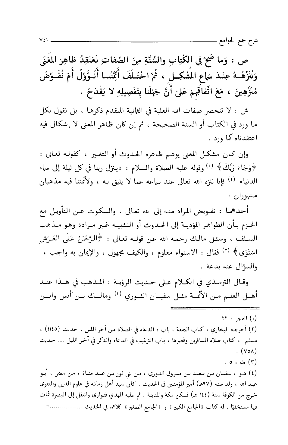 وإِن كَانَ مُشْكِلَ المَعْنَى يُوهِمُ ظَاهرُه الحُدُوثَ أَو التّغيُّرَ، كَقَوْلِهِ تعَالَى: {وجَاءَ رَبُّكَ} وقولِهِ عَلَيْهِ الصَّلاَةُ وَالسَّلاَمُ: ((يَنْزِلُ رَبُّنَا فِي كُلّ لَيْلَةٍ إِلَى سَمَاءِ الدُّنْيَا)) / (٢٣٠/أَ/م) فإِنَا نُنَزِّهُ اللَّهَ تعَالَى عِنْدَ سمَاعِه عَمَّا لاَ يَلِيقُ بِهِ، ولأَئمتِنَا فِيهِ مَذْهَبَانِ مشهورَانِ.