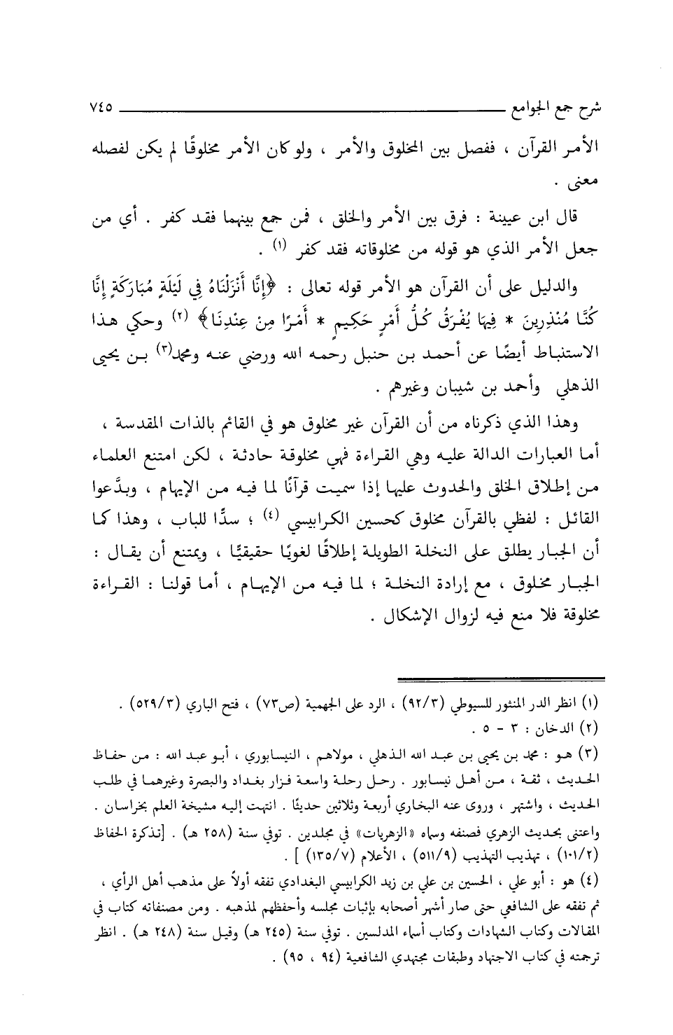 وهذَا الذي ذَكَرْنَاه مِنْ أَنَّ القرآنَ غَيْرُ مخلوقٍ هو فِي القَائمِ بِالذَّاتِ المُقَدَّسَةِ، أَمَّا العبَارَاتُ الدَّالةُ عَلَيْهِ وهي القِرَاءةُ فهي مخلوقةٌ حَادثةٌ، لَكِنِ امْتَنَعَ العُلَمَاءُ مِنْ إِطلاَقِ الخَلْقِ وَالحُدُوثِ عَلَيْهَا إِذَا سُمِّيَتْ قُرْآنًا لِمَا فِيهِ مِنَ الإِيهَامِ، وبَدَّعُوا القَائلَ: لَفْظِيٌّ بِالقرآنِ مخلوقٌ كَحُسَيْنِ الْكَرَابِيسِيِّ، سَدًّا لِلبَابِ، وهذَا كَمَا أَنَّ الجَبَّارَ يُطْلَقُ علَى النَّخْلَةِ الطّويلةِ إِطلاَقًا لُغَوِيًّا حَقِيقِيًّا، ويُمْتَنَعُ أَنْ يُقَالَ: الجَبَّارُ مخلوقٌ، مَعَ إِرَادةِ النَّخْلَةِ؛ لِمَا فِيهِ الإِيهَامُ، أَمَّا قولُنَا: القرَاءةُ مخلوقةٌ فَلاَ مَنْعَ فِيهِ؛ لِزوَالِ الإِشكَالِ.