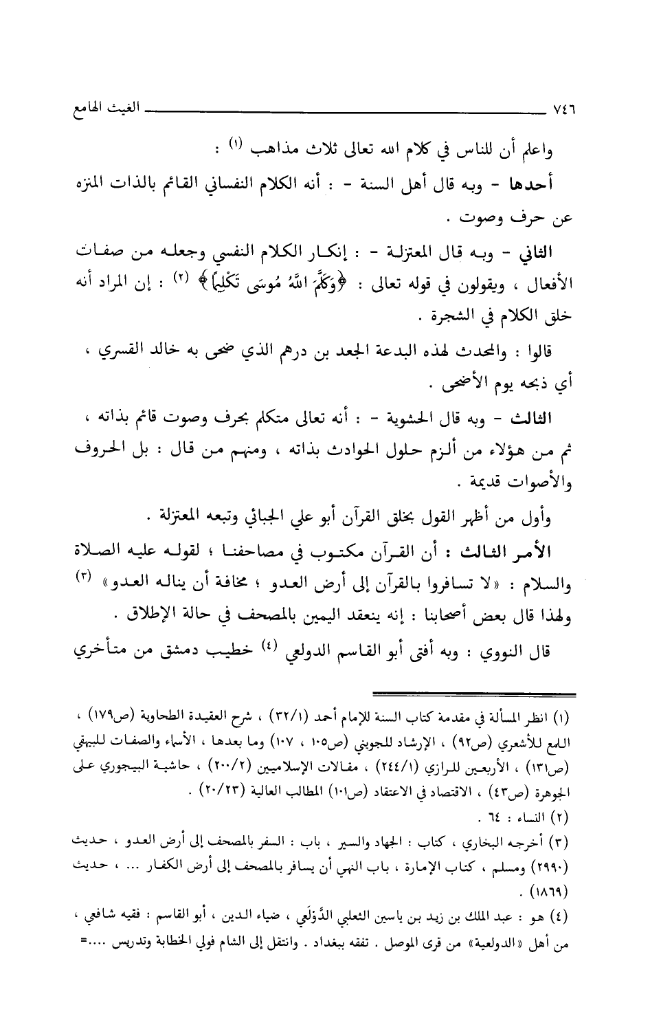 وَاعْلَمْ أَنَّ لِلنَّاسِ فِي كلاَمِ اللَّهِ تَعَالَى ثلاَثةُ مَذَاهِبَ:
