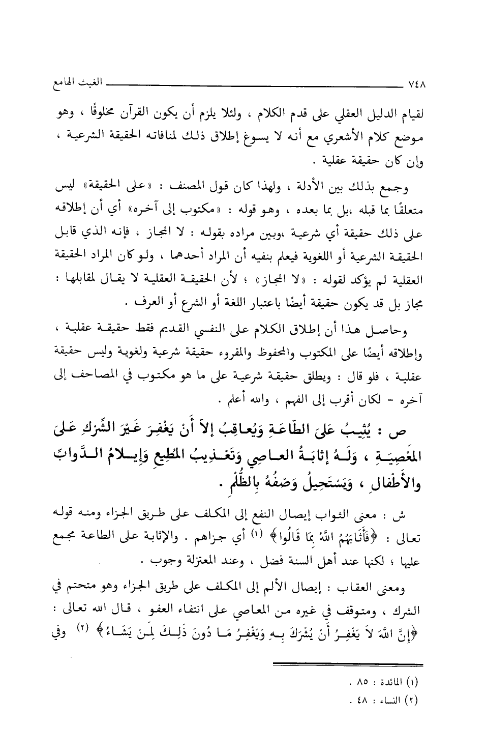 وحَاصِلُ هذَا أَنَّ إِطلاَقَ الكلاَمِ علَى النّفسيِّ القديمِ فَقَطْ حقيقةً عقليّةً، وإِطلاَقَه أَيضًا علَى المكتوبِ وَالمحفوظِ وَالمقروءِ حقيقةً شرعيةً ولغويًّة وَلَيْسَ حقيقةً عقليّةً، فلو قَالَ: ويُطْلَقُ حقيقةٌ شرعيّةٌ علَى مَا هو مكتوبٌ فِي المصَاحفِ إِلَى آخِرِهِ ـ لكَانَ أَقَرَبَ إِلَى الفَهْمِ، وَاللَّهُ أَعْلَمُ.