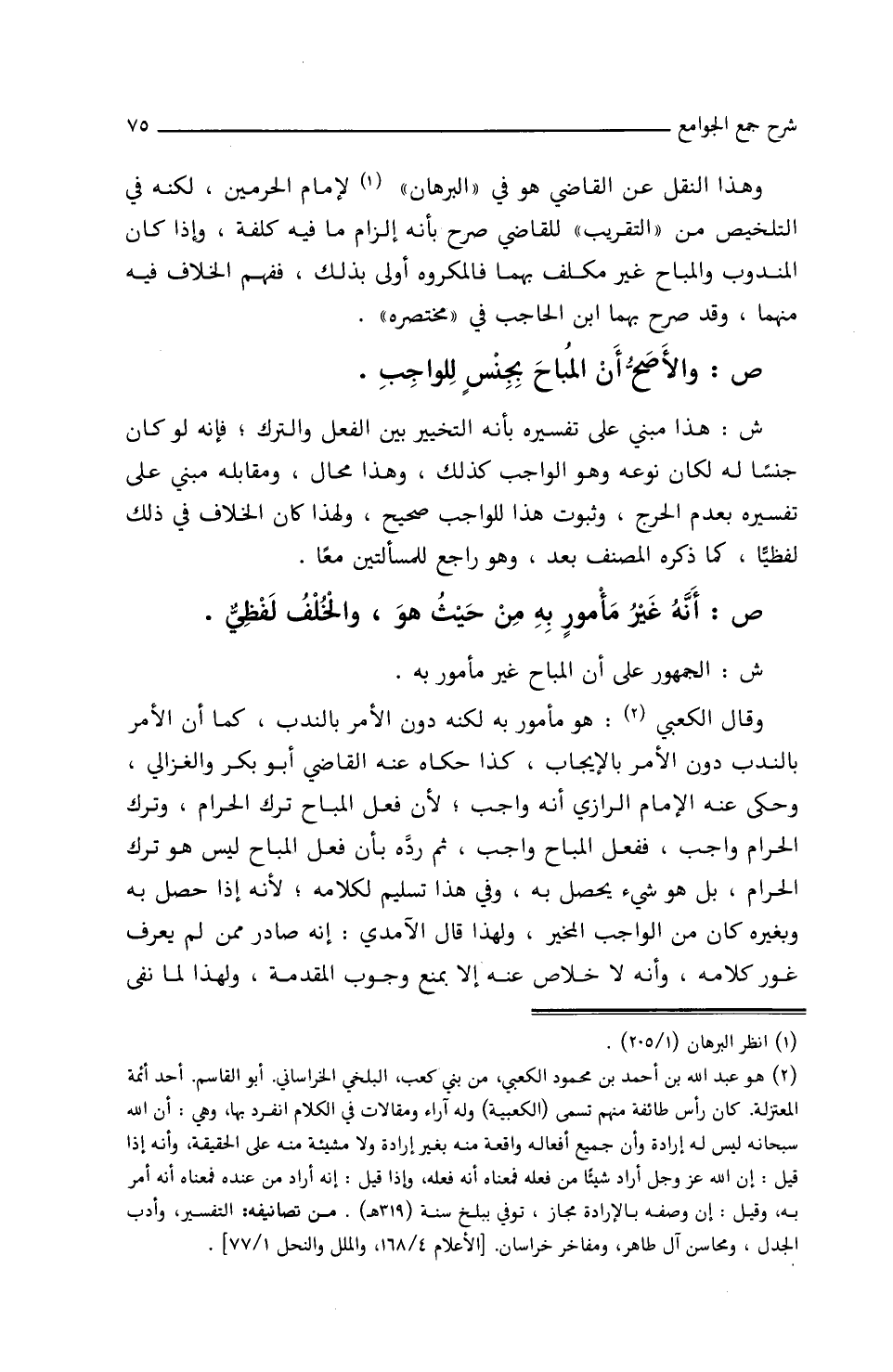 وقال الكعبي: هو مأمور به لكنه دون الأمر بالندب، كما أن الأمر بالندب دون الأمر بالإيجاب، كذا حكاه عنه القاضي أبو بكر والغزالي، وحكى عنه الإمام الرازي أنه واجب، لأن فعل المباح ترك الحرام، وترك الحرام واجب، ففعل المباح واجب، ثم رده بأن فعل المباح ليس هو ترك الحرام، بل هو شيء يحصل به، وفي هذا تسليم لكلامه لأنه إذا حصل به وبغيره كان من الواجب المخير، ولهذا قال الآمدي: إنه صادر ممن لم يعرف غور كلامه، وأنه لا خلاص عنه إلا بمنع وجوب المقدمة، ولهذا لما نفى